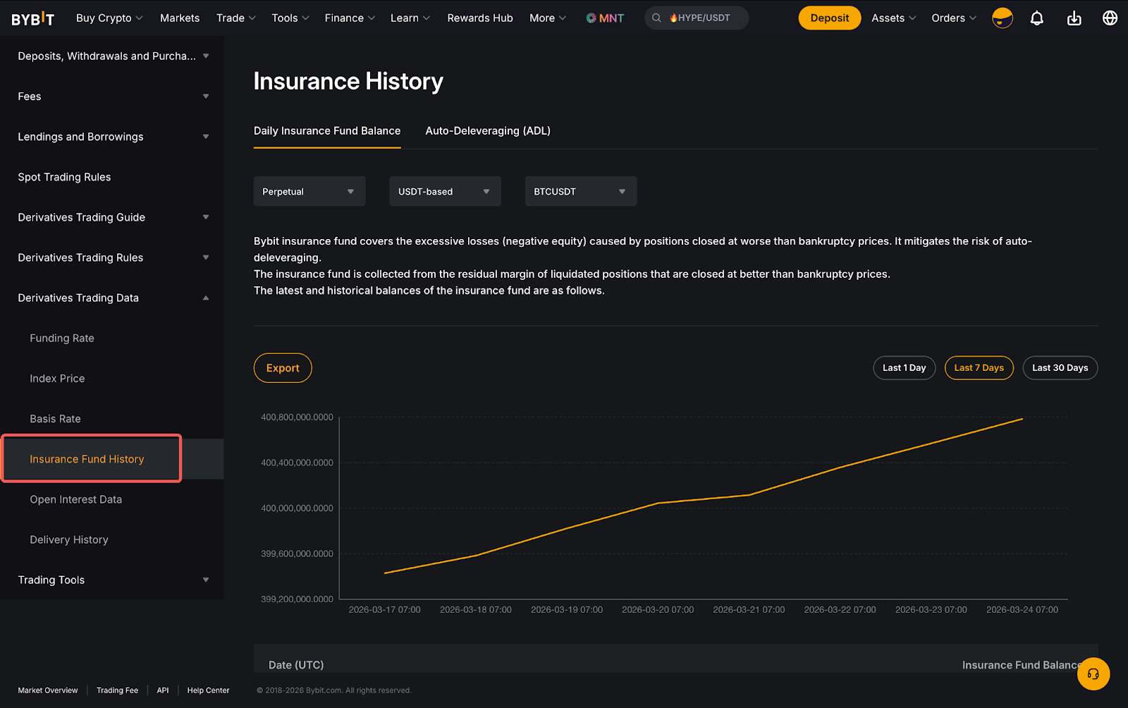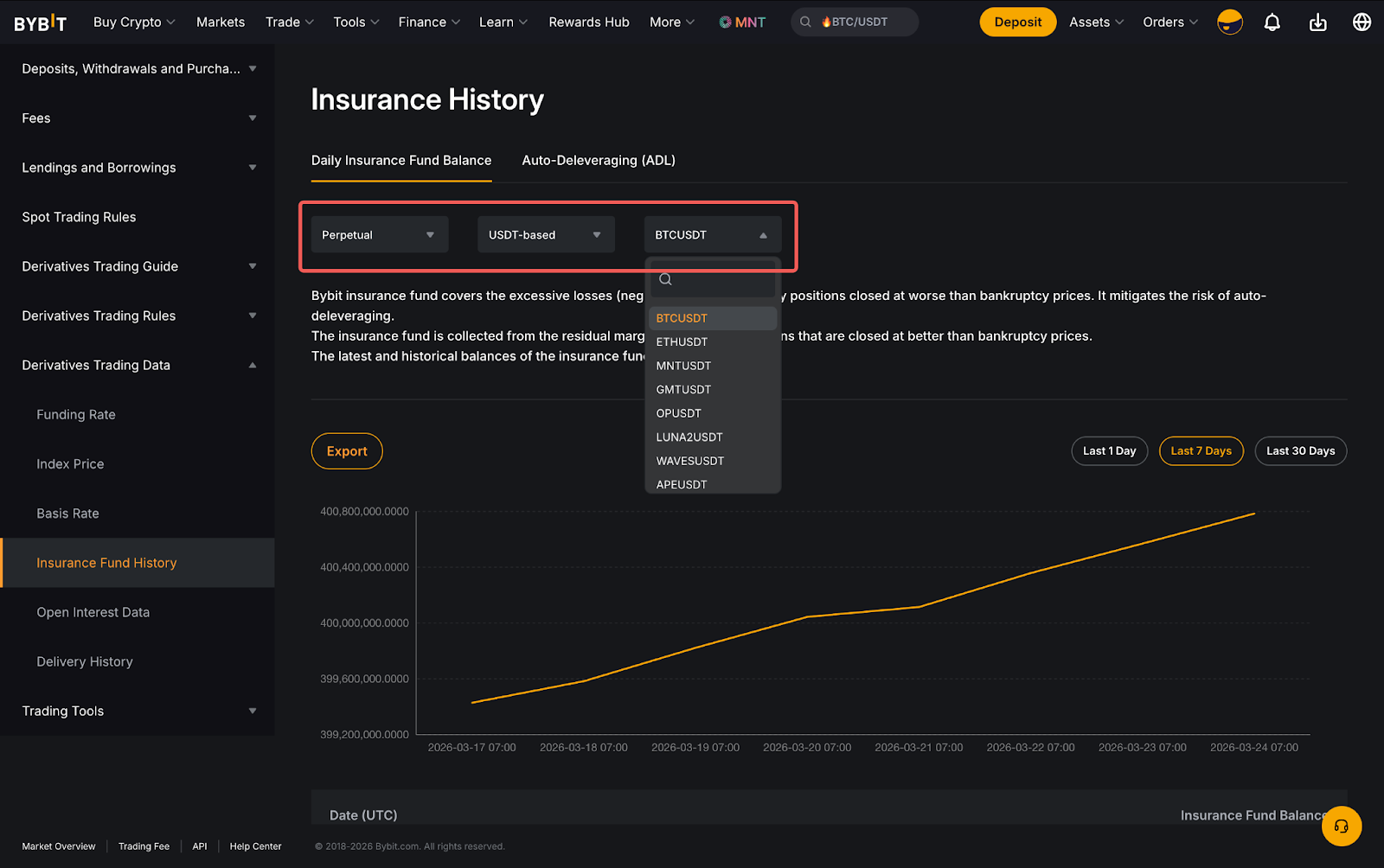 Para ver el saldo del fondo de seguro de Bybit para todos los contratos Perpetual y con vencimiento, vaya a la Descripción general del mercado de Bybit y seleccione Historial del fondo de seguro.