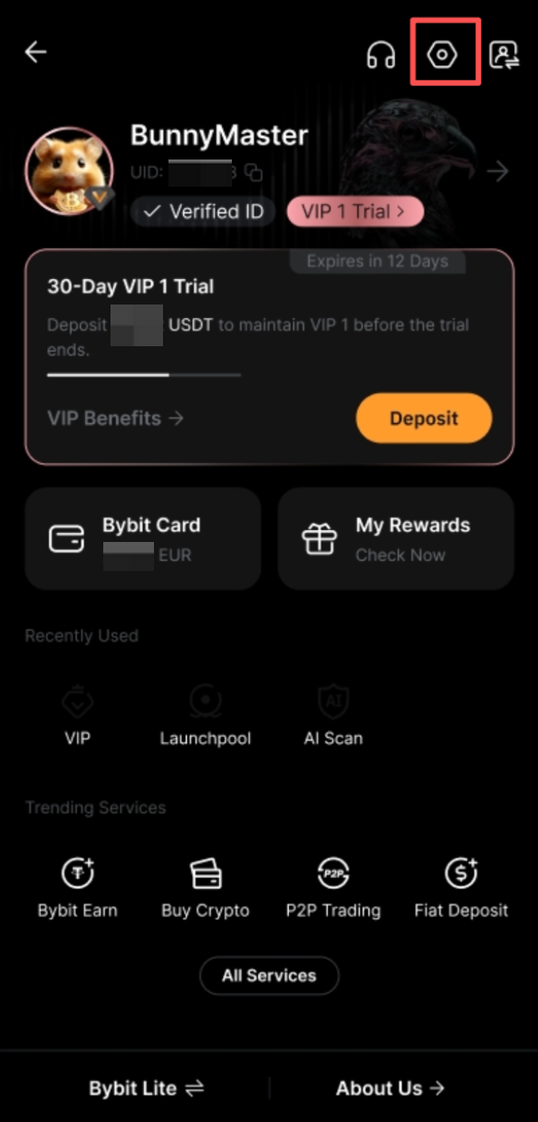 Paso 1: Abra la aplicación de Bybit, toque su foto de perfil en la esquina superior izquierda y, a continuación, toque el icono de Ajustes para abrir el Centro de usuarios.