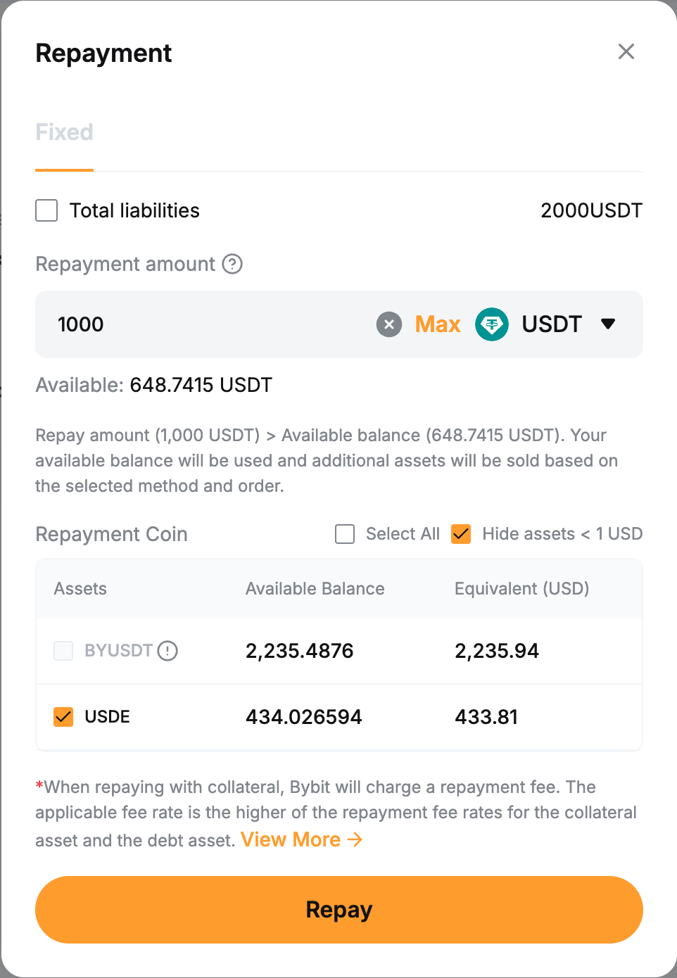 Paso 2: El sistema utilizará primero su moneda prestada disponible para el pago. Cualquier monto restante estará cubierto convirtiendo su colateral en la moneda prestada.