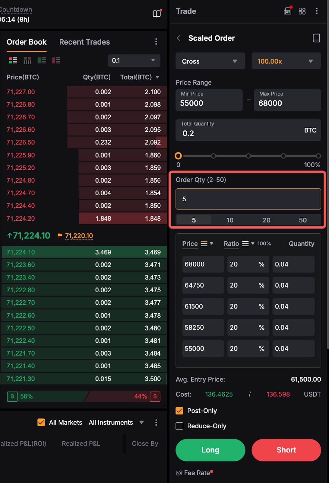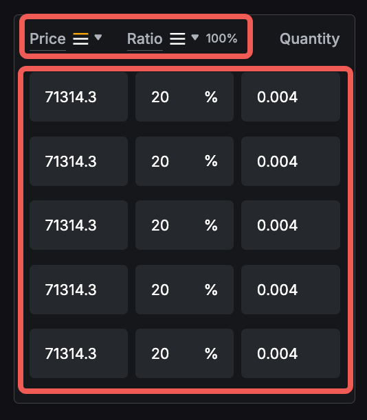 Ten en cuenta que la cantidad total mínima y máxima para una orden escalada es 10 veces el tamaño mínimo y máximo de la orden. Por ejemplo, el tamaño mínimo y máximo de la orden de BTCUSDT es de 0,001 BTC y 100 BTC respectivamente. Consecuentemente, la cantidad total mínima y máxima de orden en la orden escalada será de 0,01 BTC y 1000 BTC respectivamente.