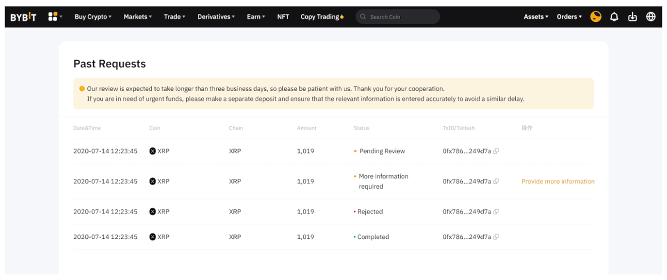 Por ejemplo, usted hizo un retiro de Exchange A a Bybit, por favor inicie sesión en Exchange A y muéstrenos los detalles del retiro.
