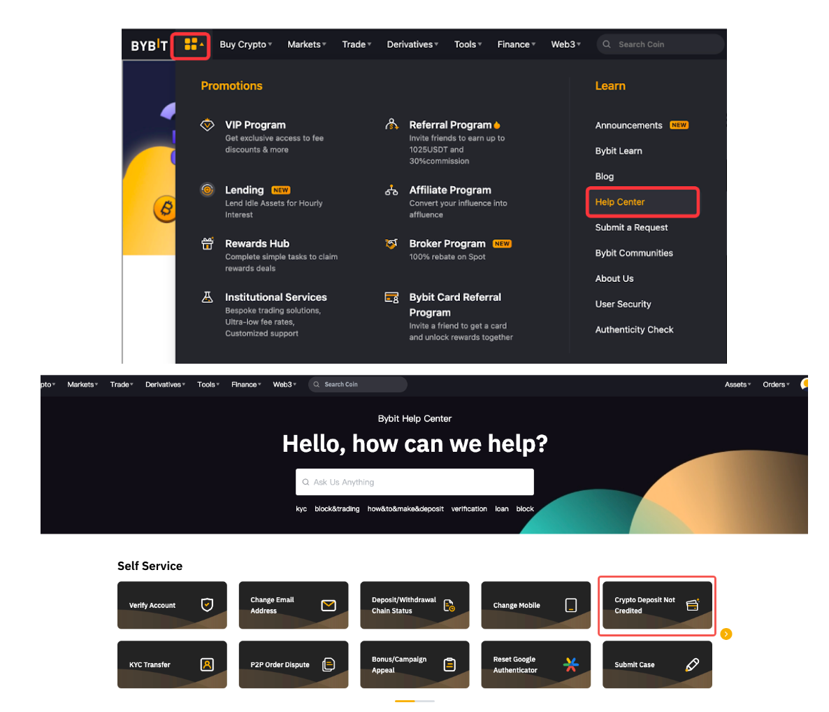 Paso 1: Pase el ratón por la esquina superior izquierda para buscar Centro de ayuda → Seleccione Criptodepósito no abonado, y será redirigido a la página de autoservicio.