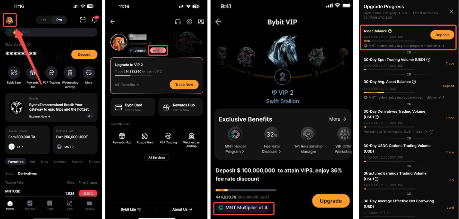 Jika menggunakan aplikasi, ketuk foto profil Anda di sudut kiri atas, lalu ketuk level VIP untuk melihat status pengganda MNT Anda.