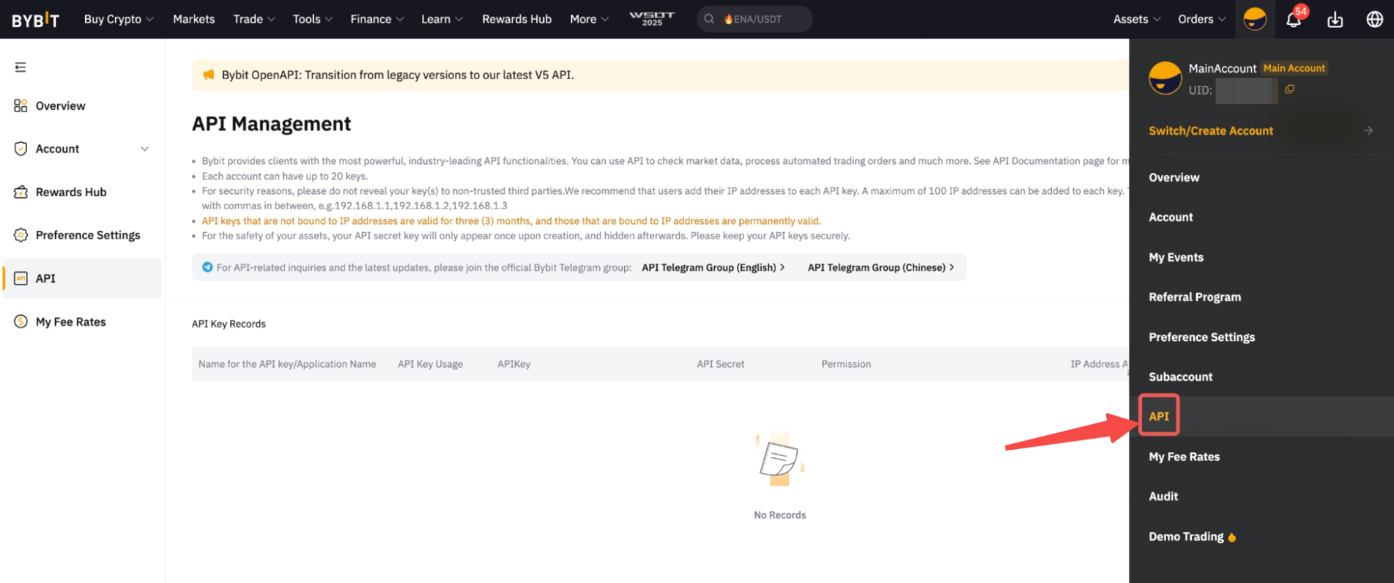 Langkah 1: Arahkan kursor ke ikon profil di sudut kanan atas laman Bybit, lalu klik API.