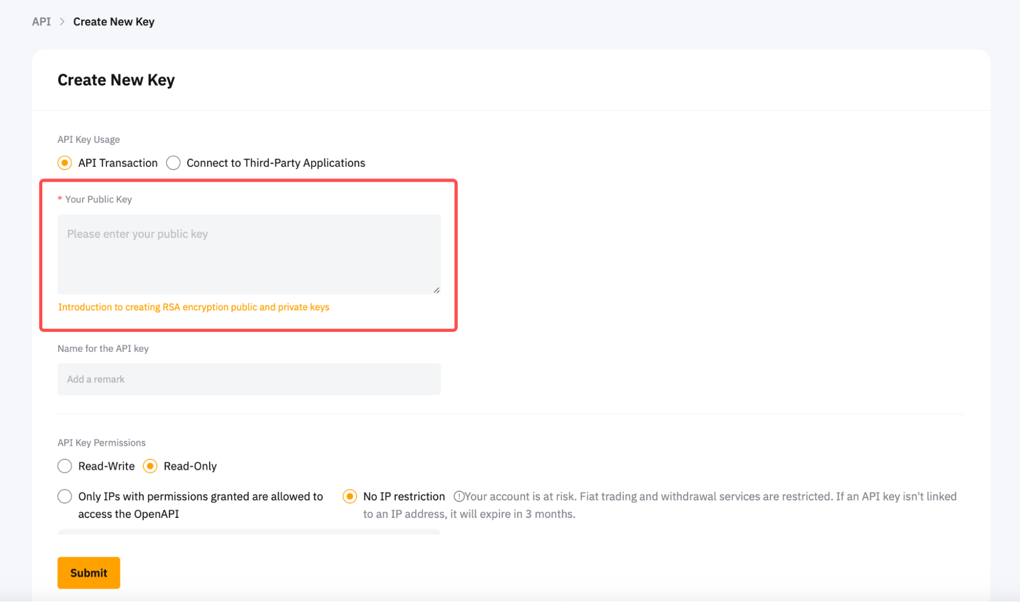 Catatan: API RSA tidak menampilkan bidang Kata Sandi Kunci API.