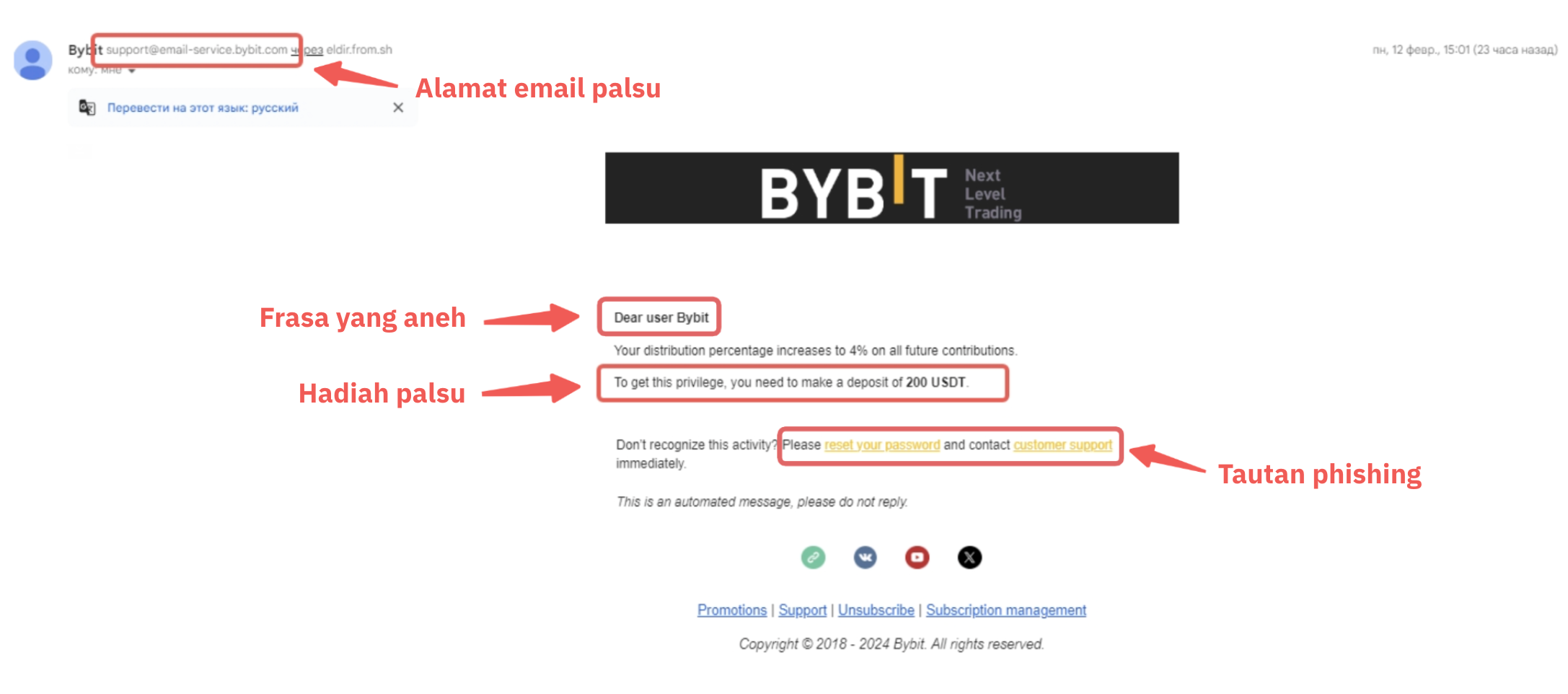 Verifikasi informasi kontak pengirim (misalnya alamat email, nomor telepon, URL situs web, dll.) terhadap saluran resmi Bybit yang sah dengan mencari inkonsistensi atau elemen-elemen yang mencurigakan.