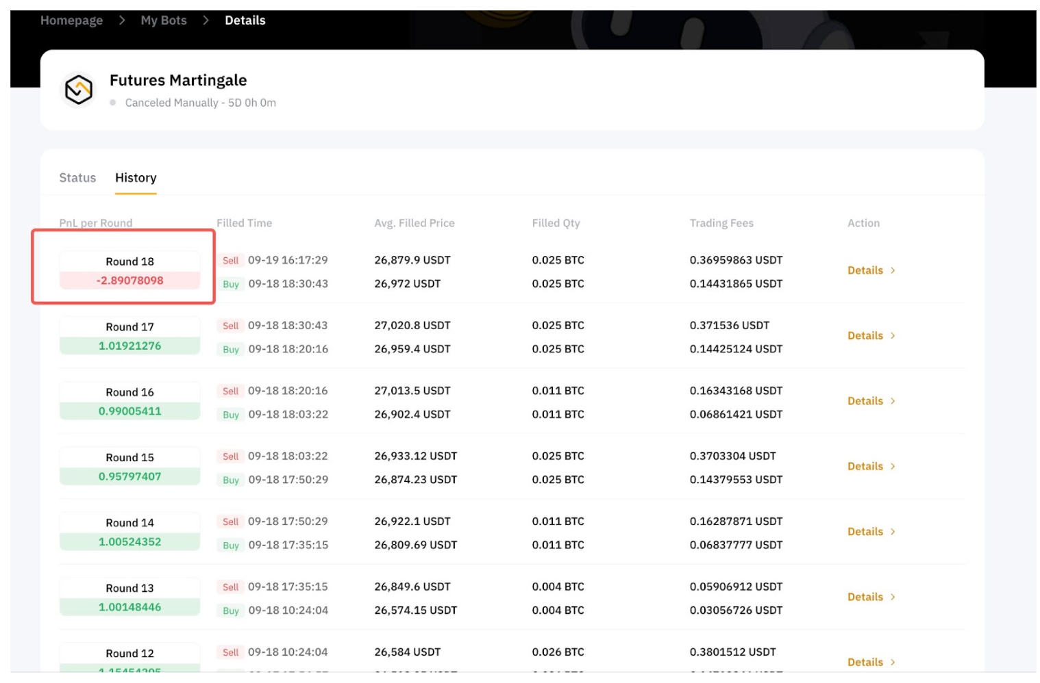 「マイボット」に進むと、すべての有効な取引ラウンドと完了した取引ラウンドを確認することができます。次に、「詳細」をクリックすると、利益、合計年換算利回り、実現利益など、取引の詳細を見ることができます。