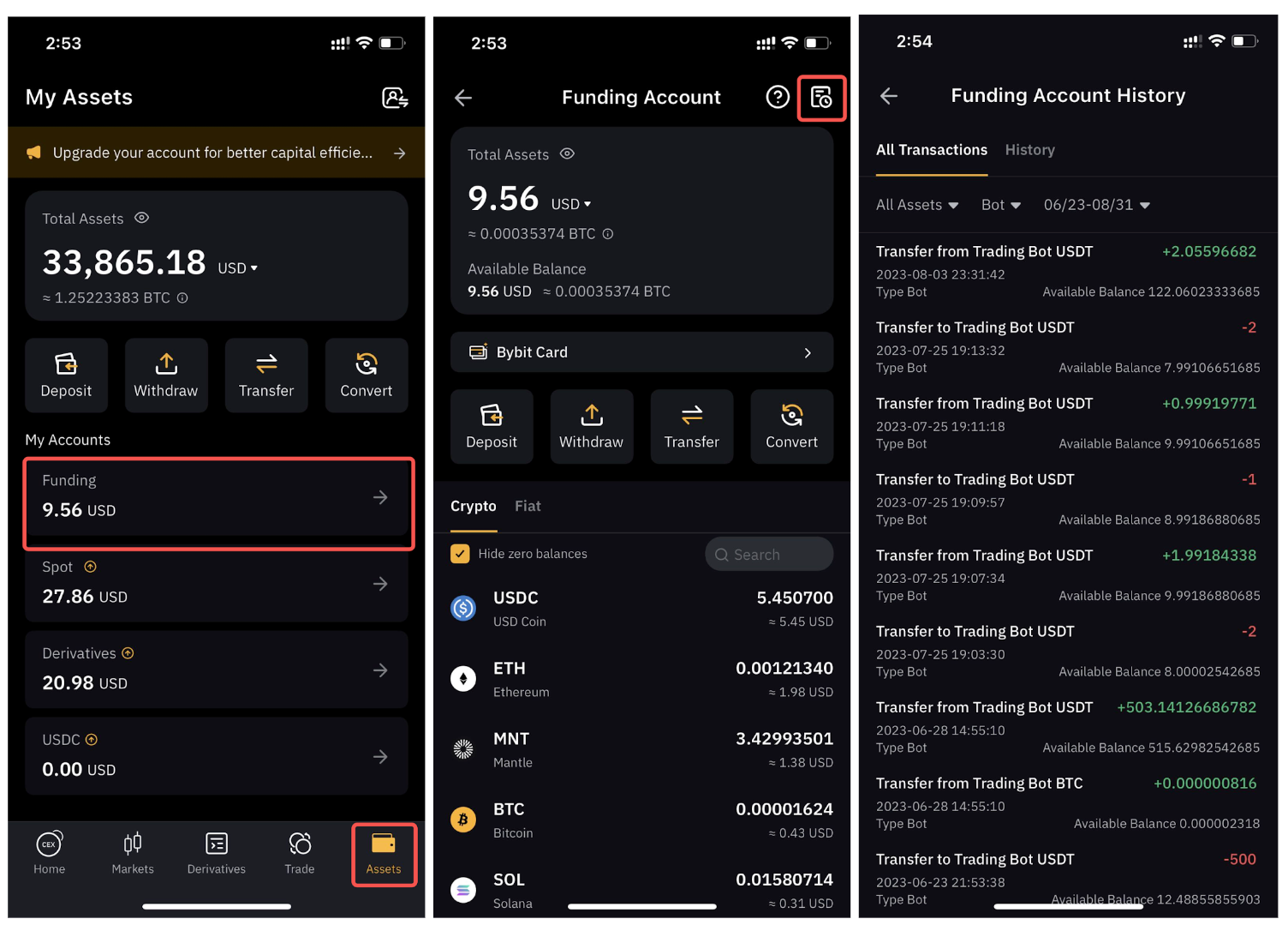 Bybitのウェブサイトでは、「資金調達アカウント」 → 「履歴」とクリックして、資金調達アカウントの履歴ページに移動します。取引ボットとの資金振替記録がこのページに表示されています。