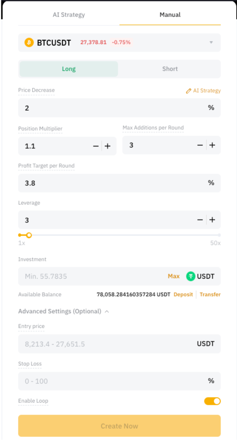 「投資額」は、ボットで投資したいUSDTの額です。システムは、設定されたパラメータに基づいて、ボット作成に必要な最低投資額を決定します。これにより、必要最低額以上の投資が可能になります。投資額が大きくなればなるほど、より大きな注文サイズで注文を出すことができます。 ボットを作成するには、資金調達アカウントに十分な資金(USDT)を保有している必要がありますのでご注意ください。 |