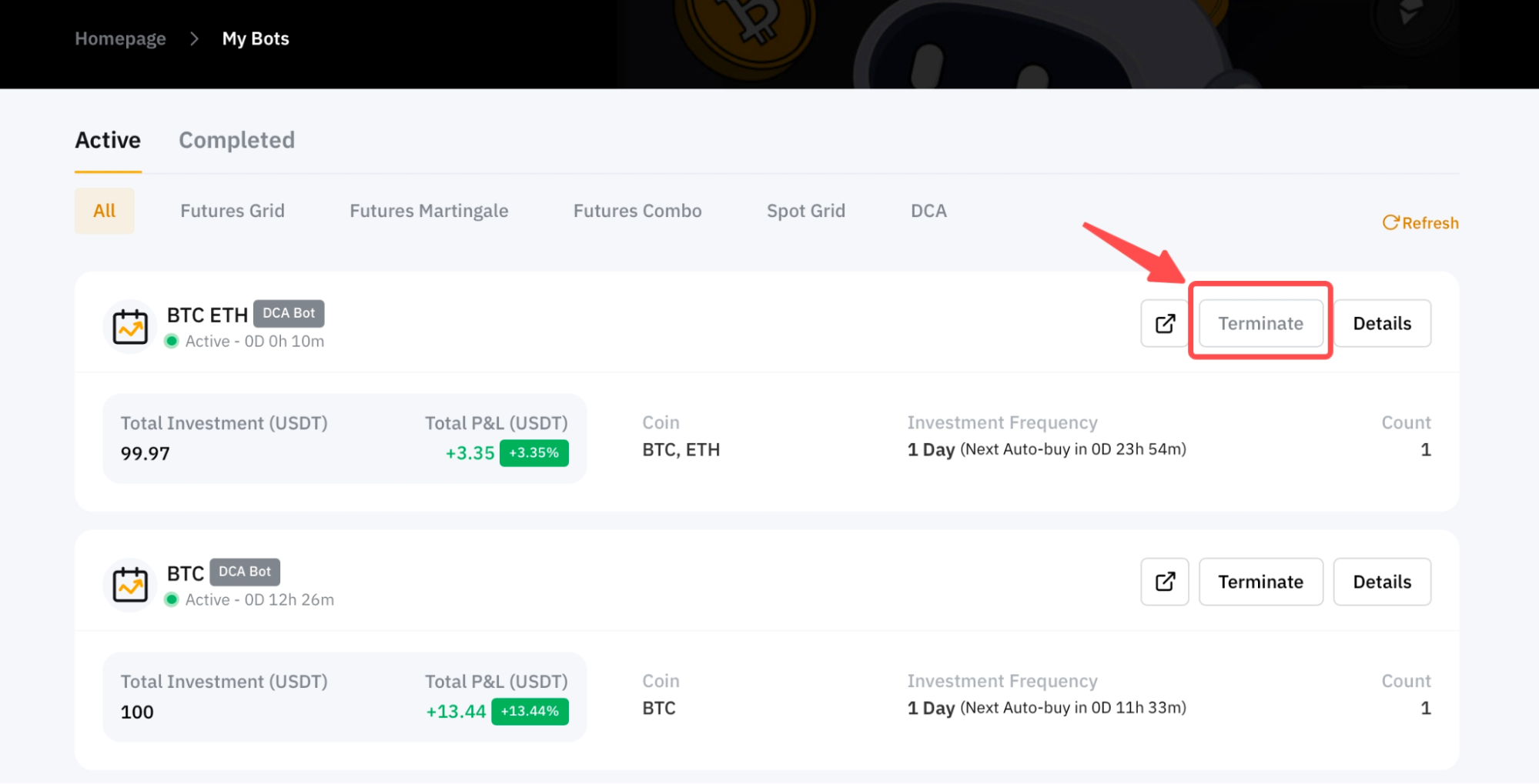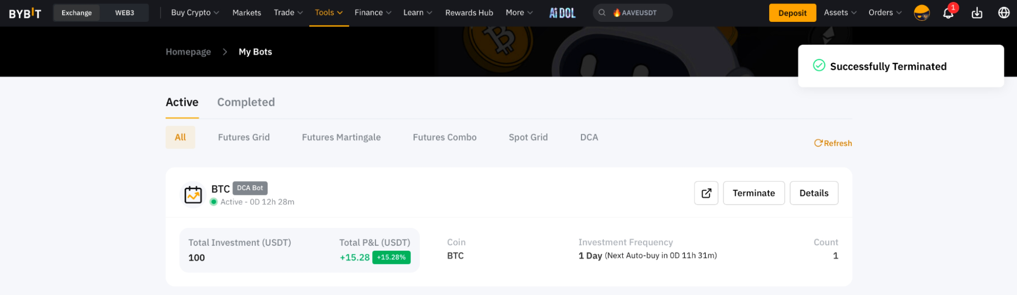 ステップ2:積立ボット欄の右上の「終了」をクリックし、積立ボットを終了します。