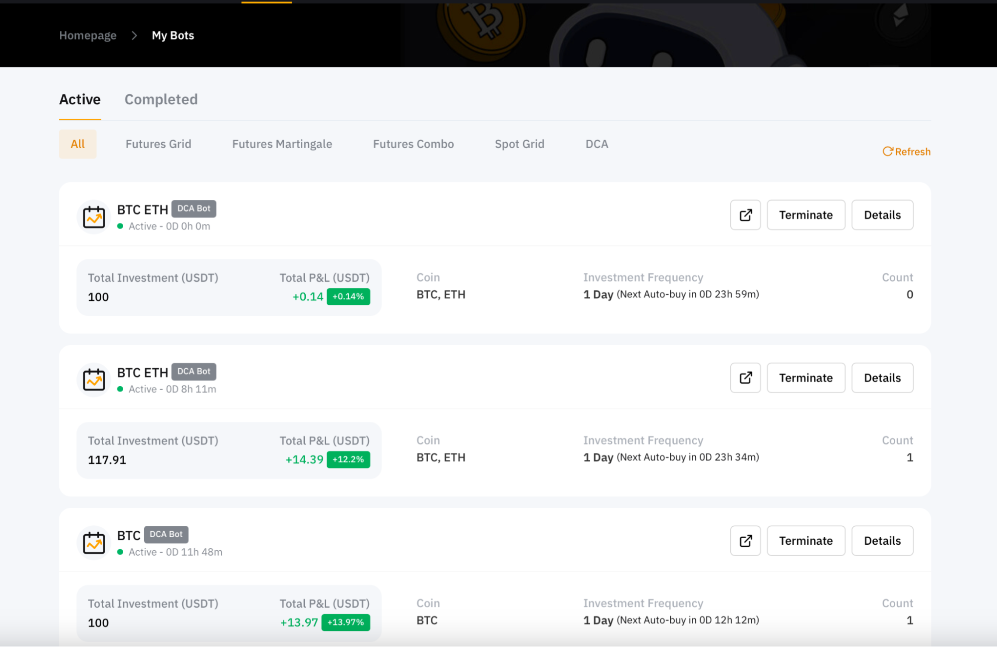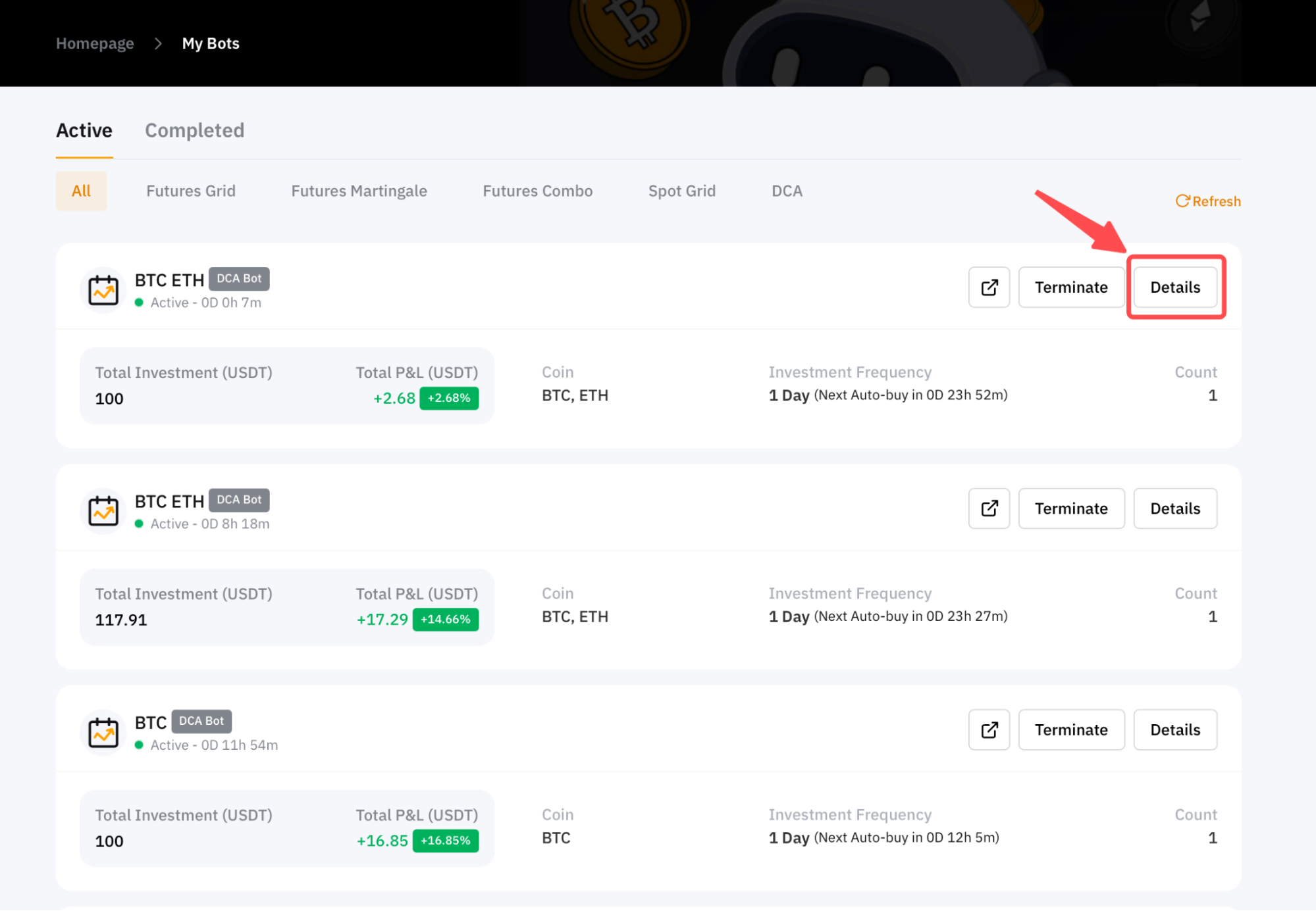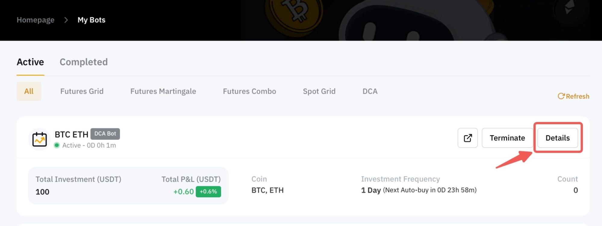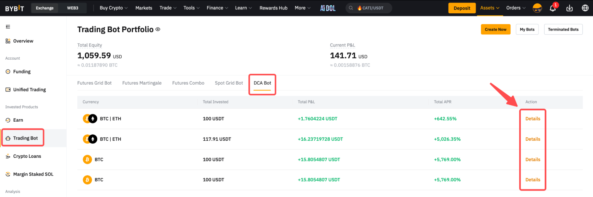 または、取引ボットアカウント資産ページのDCAボット、実行中のDCAボットの詳細、つまり、コイン、合計投資額、合計損益、合計APRを確認できます 資産ページでは、すべてのアクティブ取引ボットの合計資産額と未実現損益を確認できます。