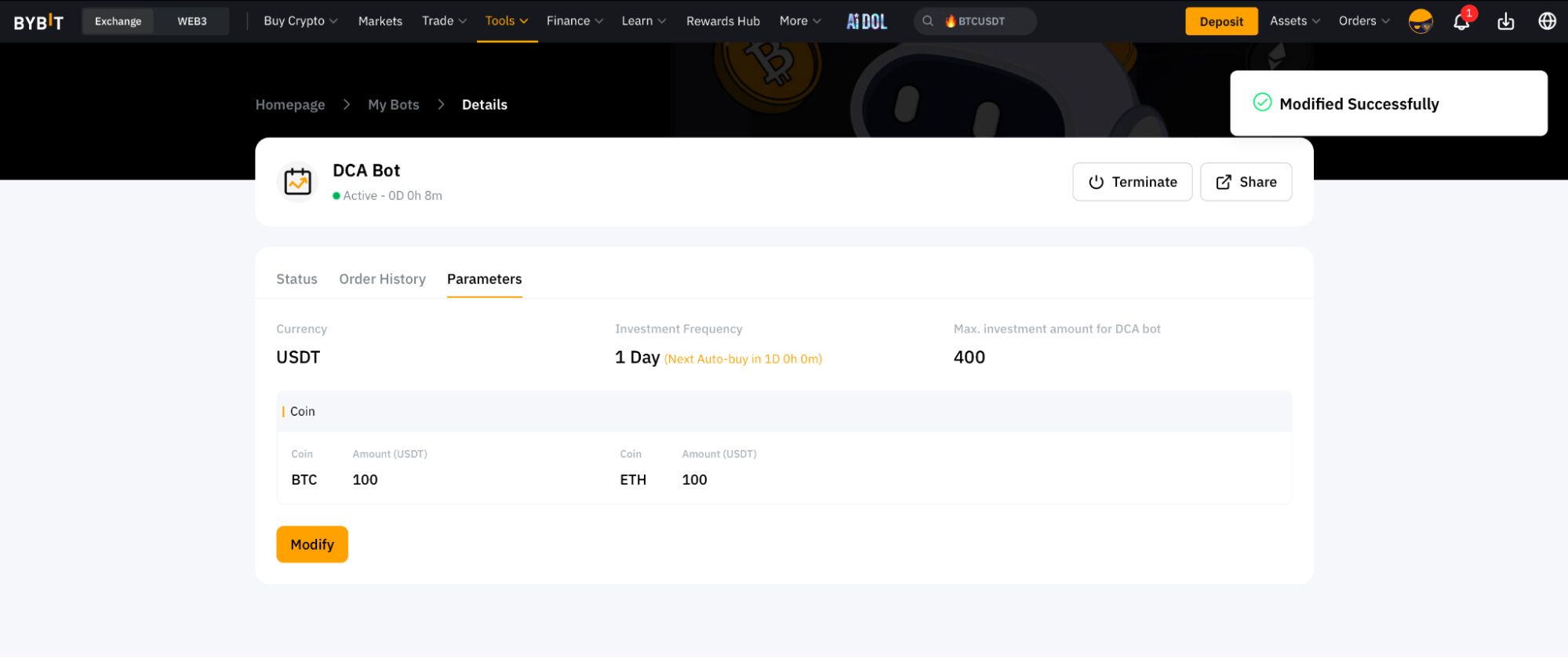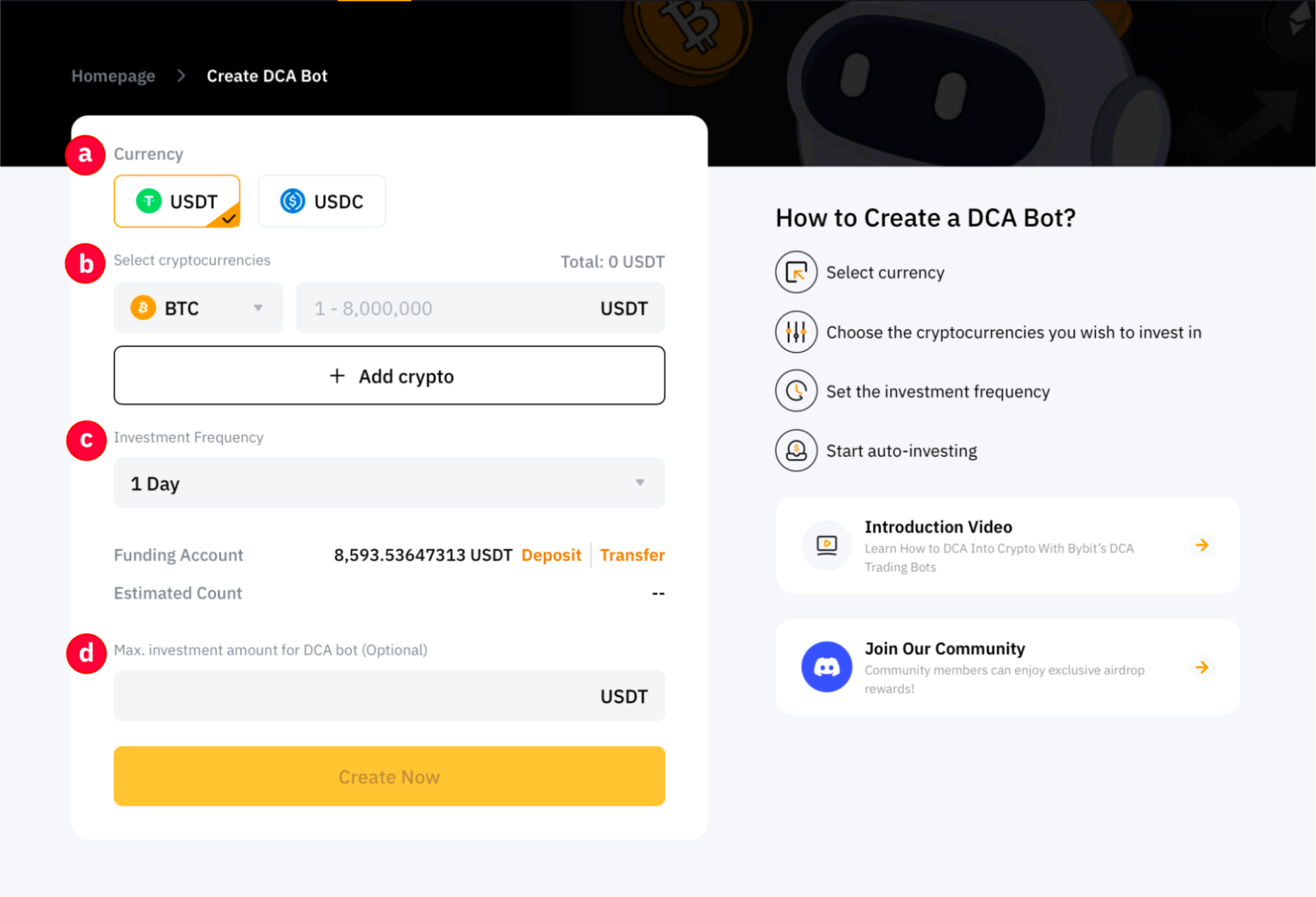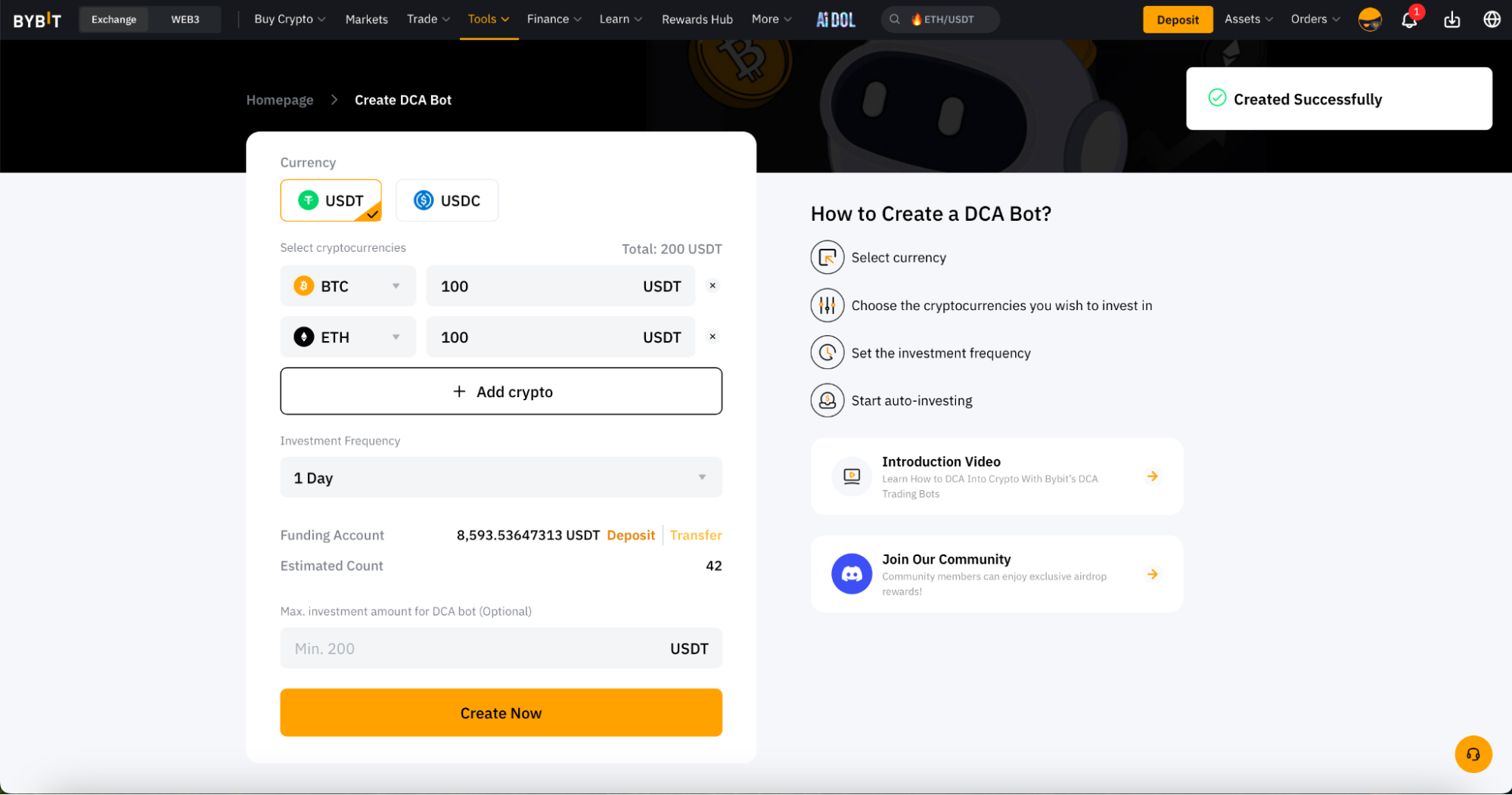 注意:各定額投資額には、現物市場の1取引あたりの最低注文価値と最高注文価値が適用されます。詳細は、Bybit現物取引規定でご確認いただけます。