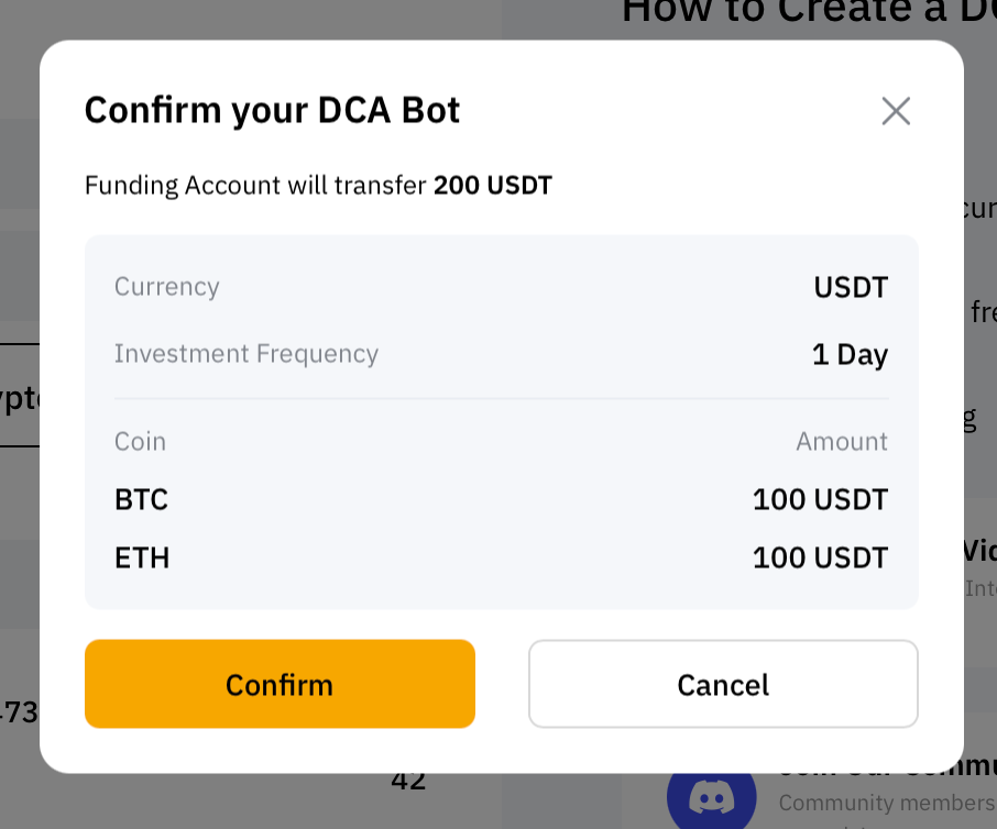 ステップ4:作成した積立ボットの内容を確認したら、「確認」をクリックして取引を開始します。