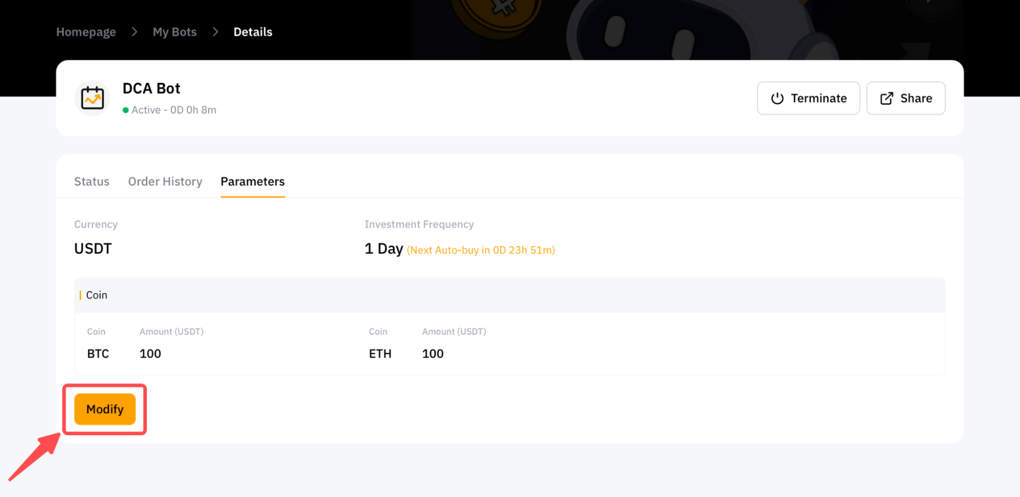 ステップ1:Bybit取引ボットページの左上隅にある「マイボットを表示」をクリックします。 次にパラメータを変更したい積立ボットの右上の「詳細」をクリックします。