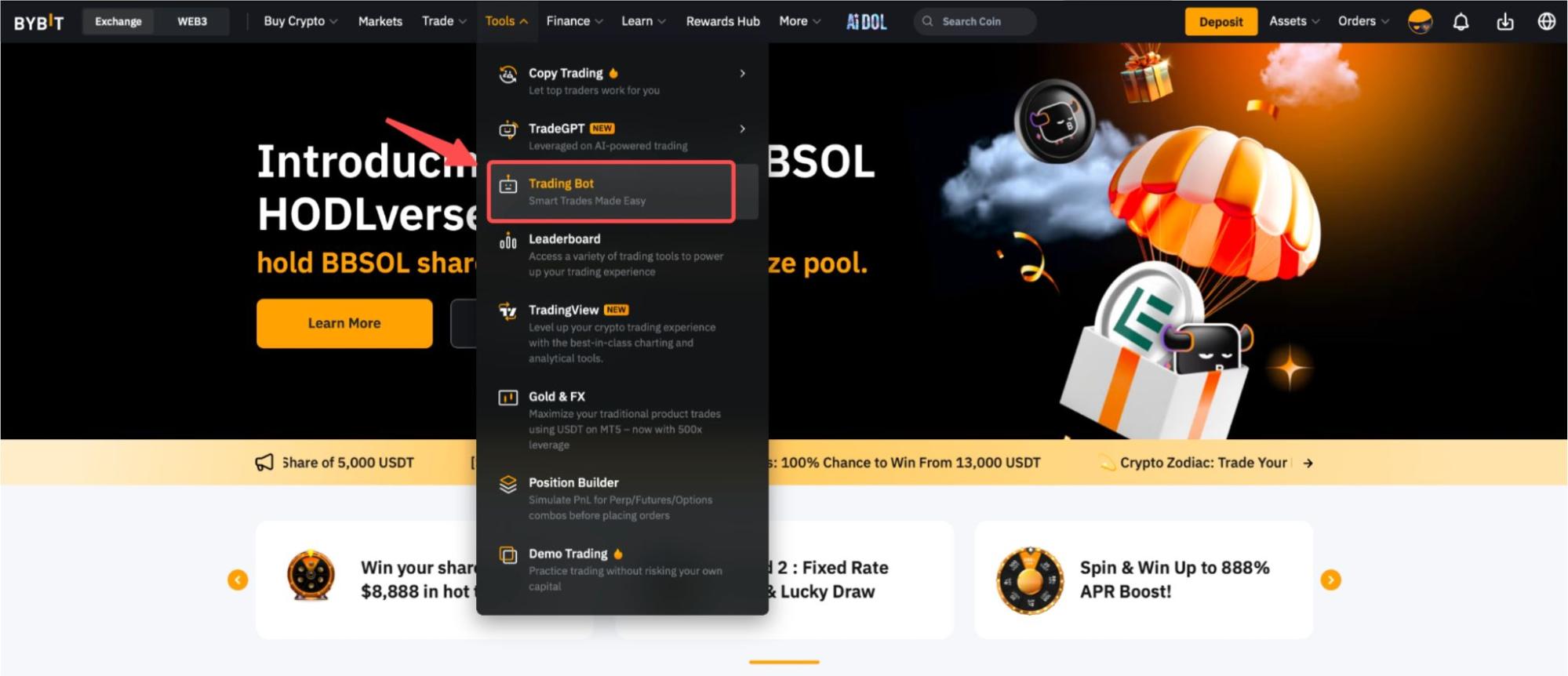 ステップ1: ナビゲーションバーの「ツール」 → 「取引ボット」をクリックして、「Bybit取引ボット」ページに進んでください。
