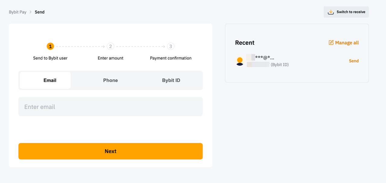 ここでは、Bybit Payでの送金方法について、下記にて説明します。
