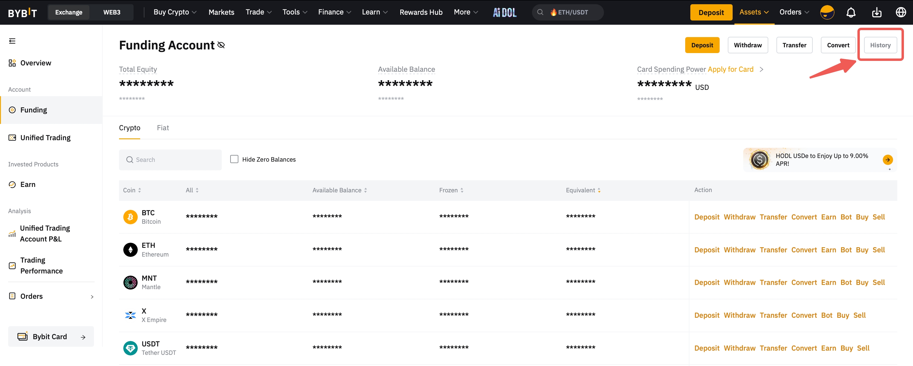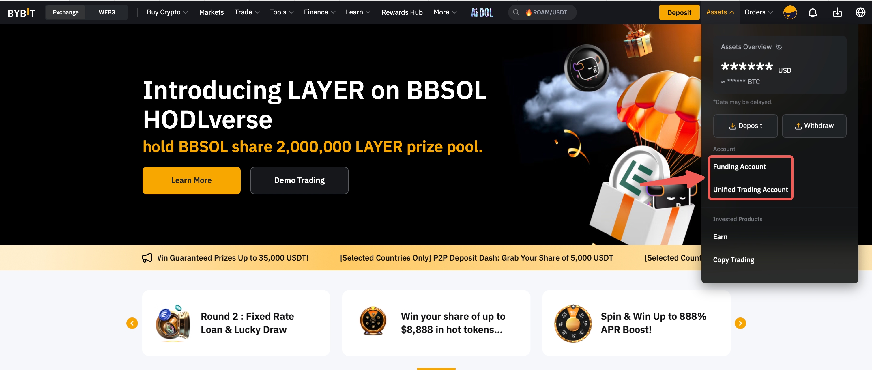 ステップ1:Bybitホームページの右上隅にある資産をクリックし、資金が入金されているアカウントを選択します。