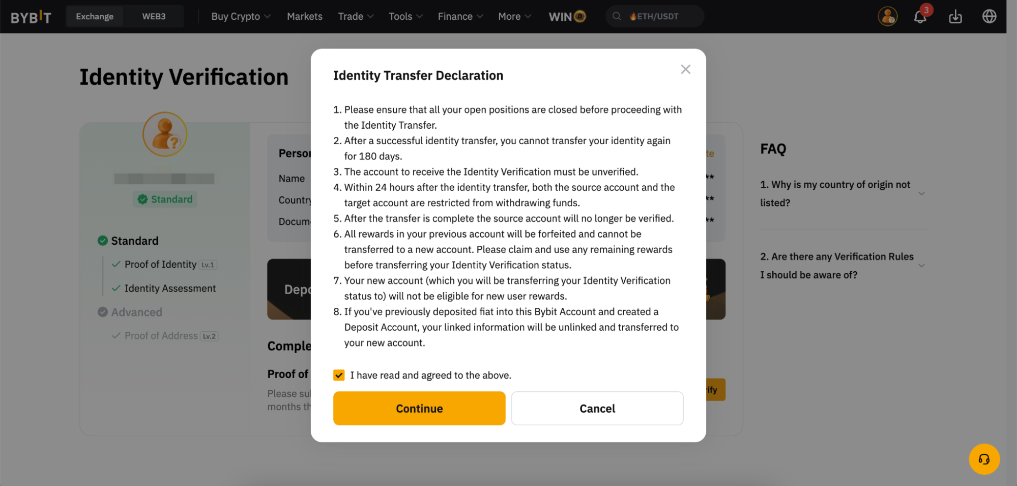 10. Bybit カードご利用中のお客様は、本人確認情報の移行を進める前に、カード管理画面からBybitカードを解約することをお勧めします。詳細については、 Bybit カードに関する一般的な質問をご覧ください。