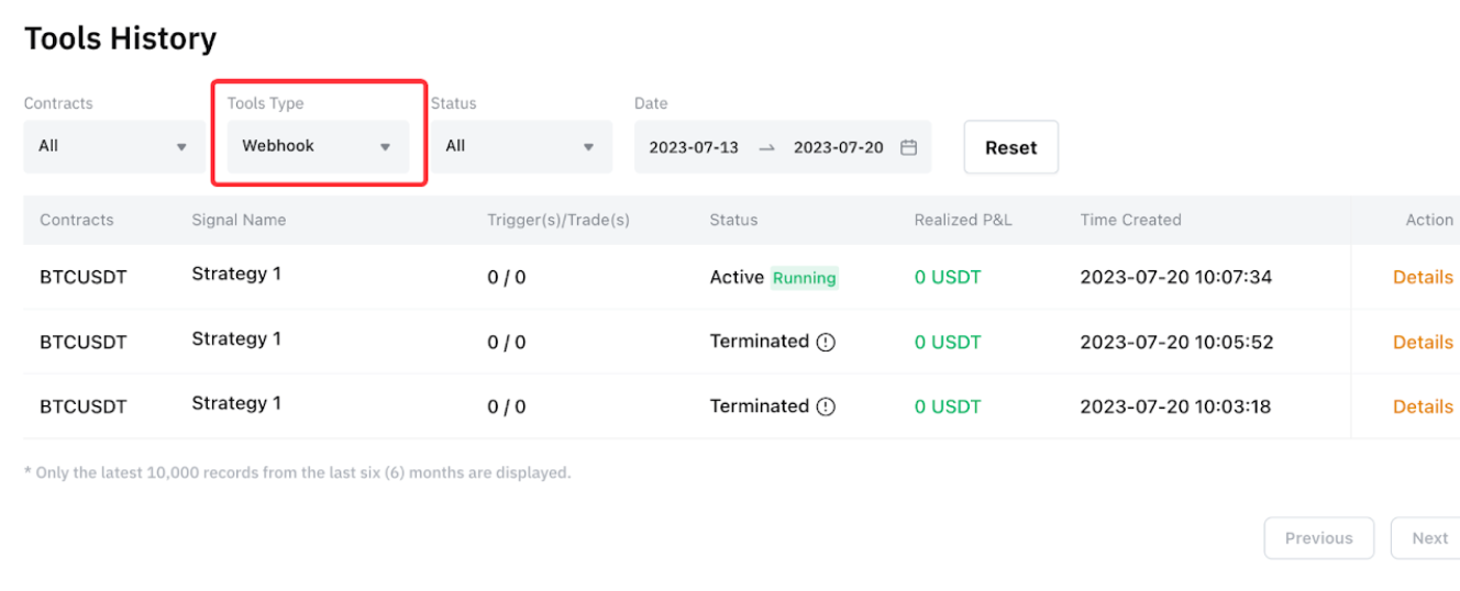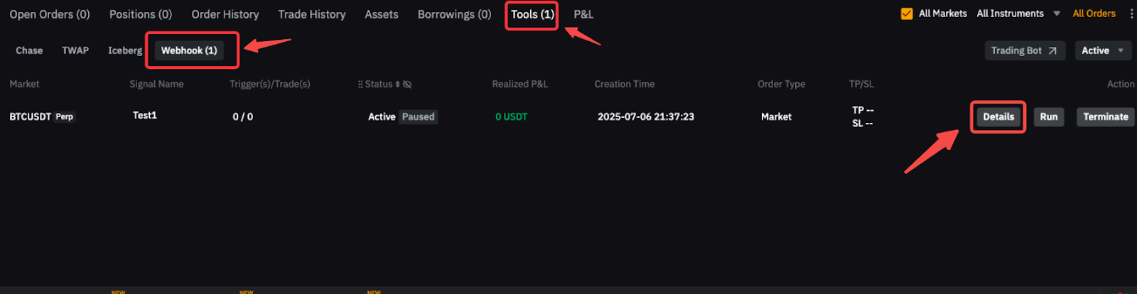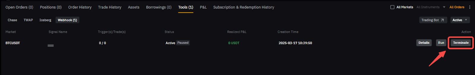 手動での終了または一時停止:Webhookシグナルを手動で終了するには、「ツール」タブに移動し、終了したいWebhookによって開始されたシグナルを探して「終了」をクリックします。戦略を一時的に停止する場合は、「一時停止」をクリックします。