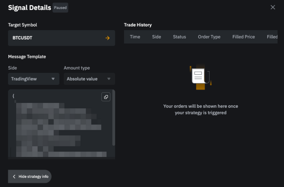 シグナルの詳細情報をさらに表示するには、横にある「詳細」ボタンをクリックします。Webhook URLとメッセージテンプレートを確認できます。また、この戦略で約定した取引も表示されます。