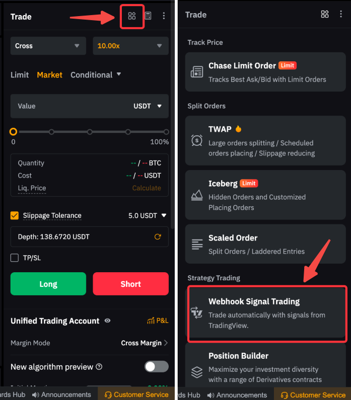 以下のセクションでは、BybitにおけるWebhookシグナル取引の設定・利用方法について、順を追ってご説明します。開始前に、アカウントに十分な資金があることをご確認ください。