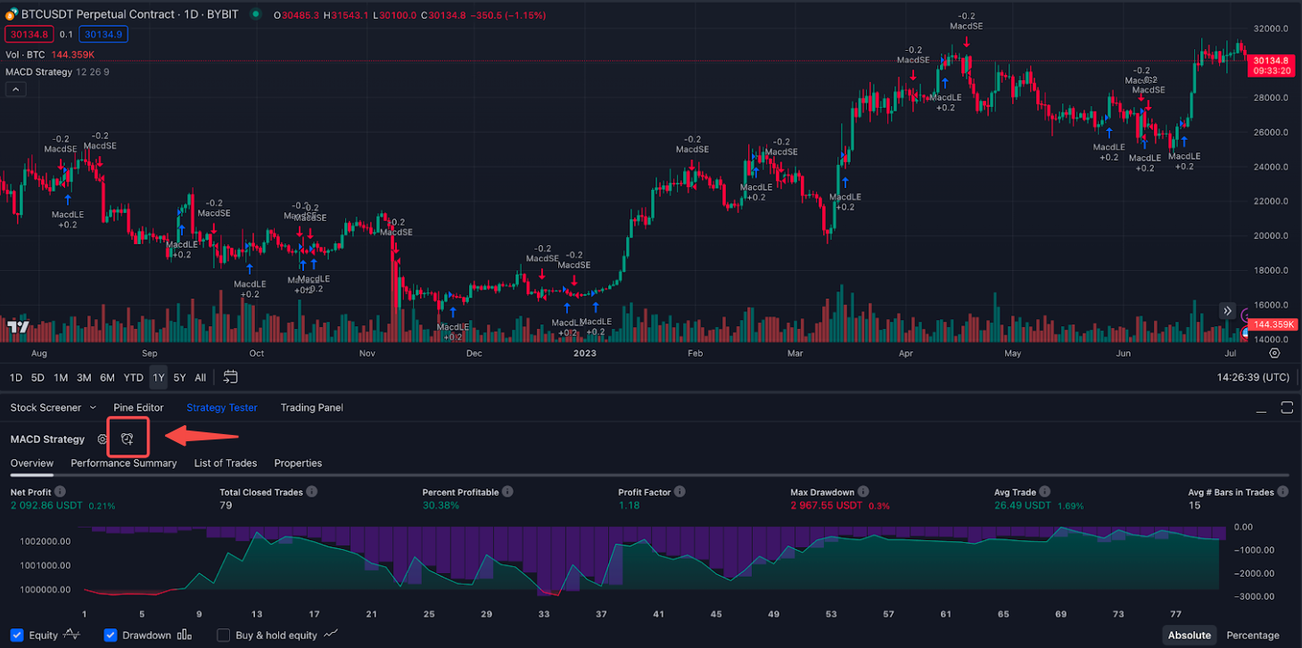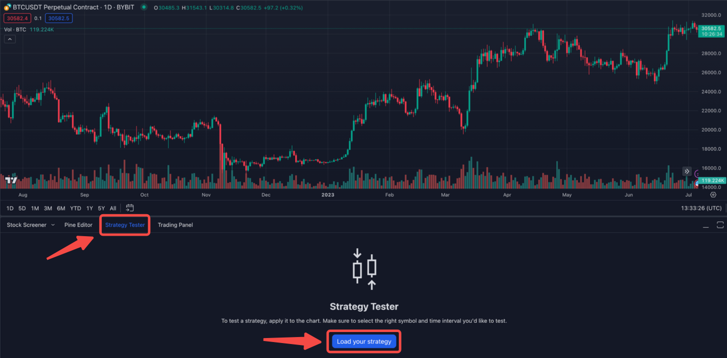 ステップ2:TradingViewページで「ストラテジーテスター」をクリックし、戦略を読み込みます。