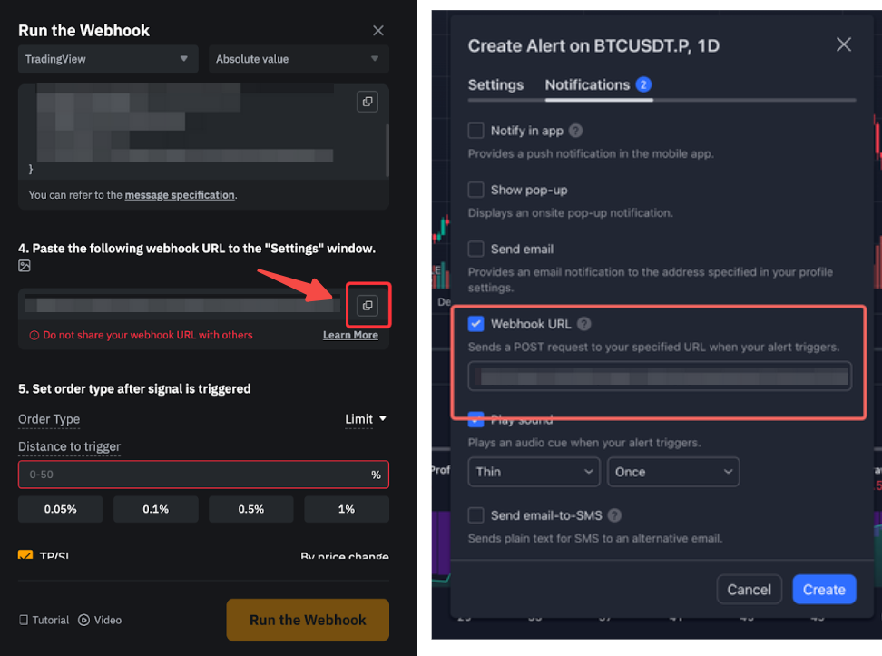 WebhookのURLはBybitページにあり、アラート通知タブのWebhookのURLフィールドに貼り付ける必要があります。