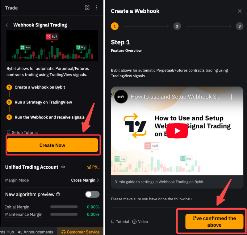 ステップ2:「今すぐ作成」をクリックします。作業を進めるには、この機能の概要を理解する必要があります。Webhookシグナル取引の実行方法については、チュートリアル動画をご覧ください。その後、「上記を確認しました」をクリックしてください。