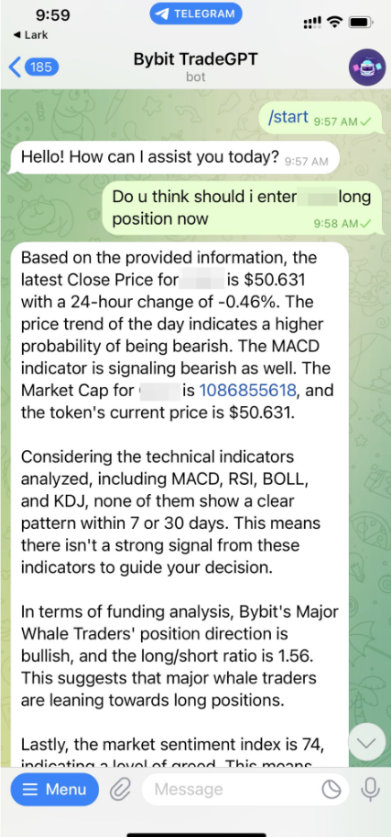 簡単なアクセスとエキスパートの分析:TelegramでTradeGPTと直接つながれば、Bybitからのリアルタイムのデータを簡単に入手できます。最先端のデータ分析機能による高度な分析も可能です。