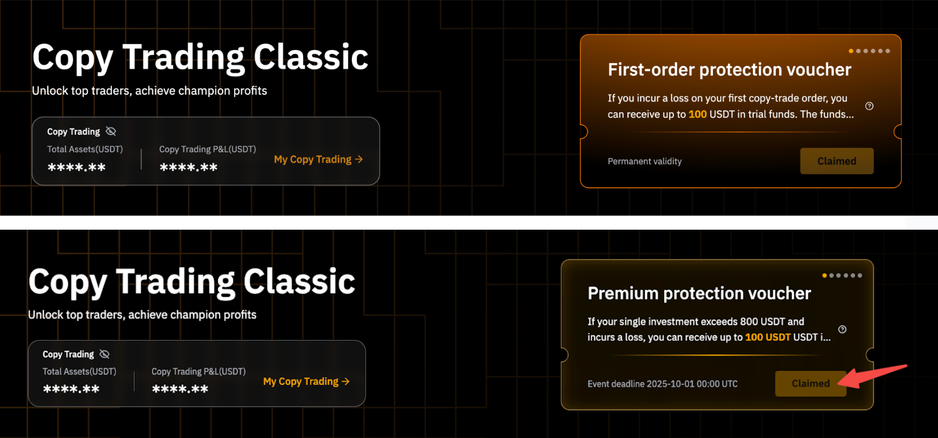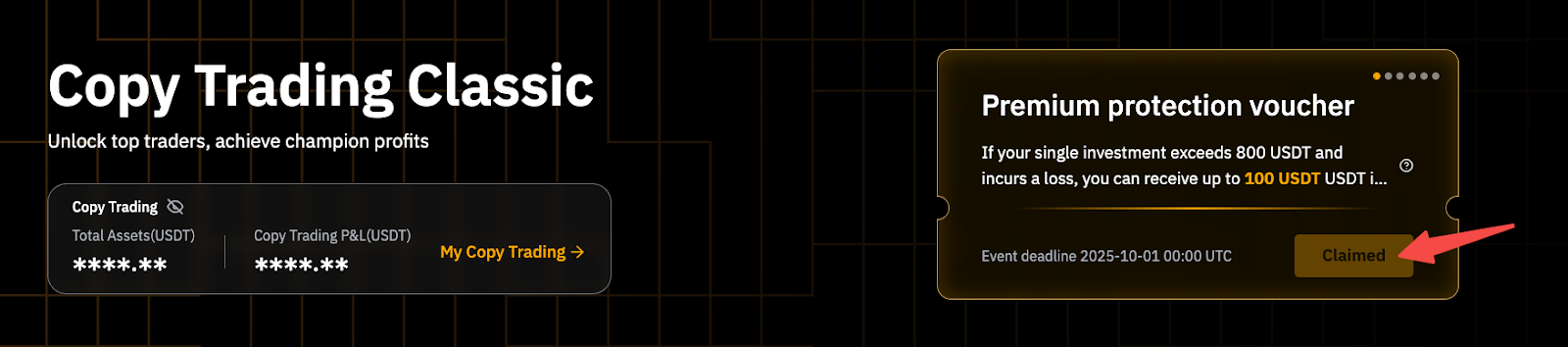 • Premium Protection Voucher: It can be claimed once every quarter on the top right corner of Copy Trading Classic or Copy Trading TradFi. Within the same quarter, you're eligible for compensation—up to 100 USDT—for losses from a single eligible Master Trader. This benefit can only be used once per quarter.