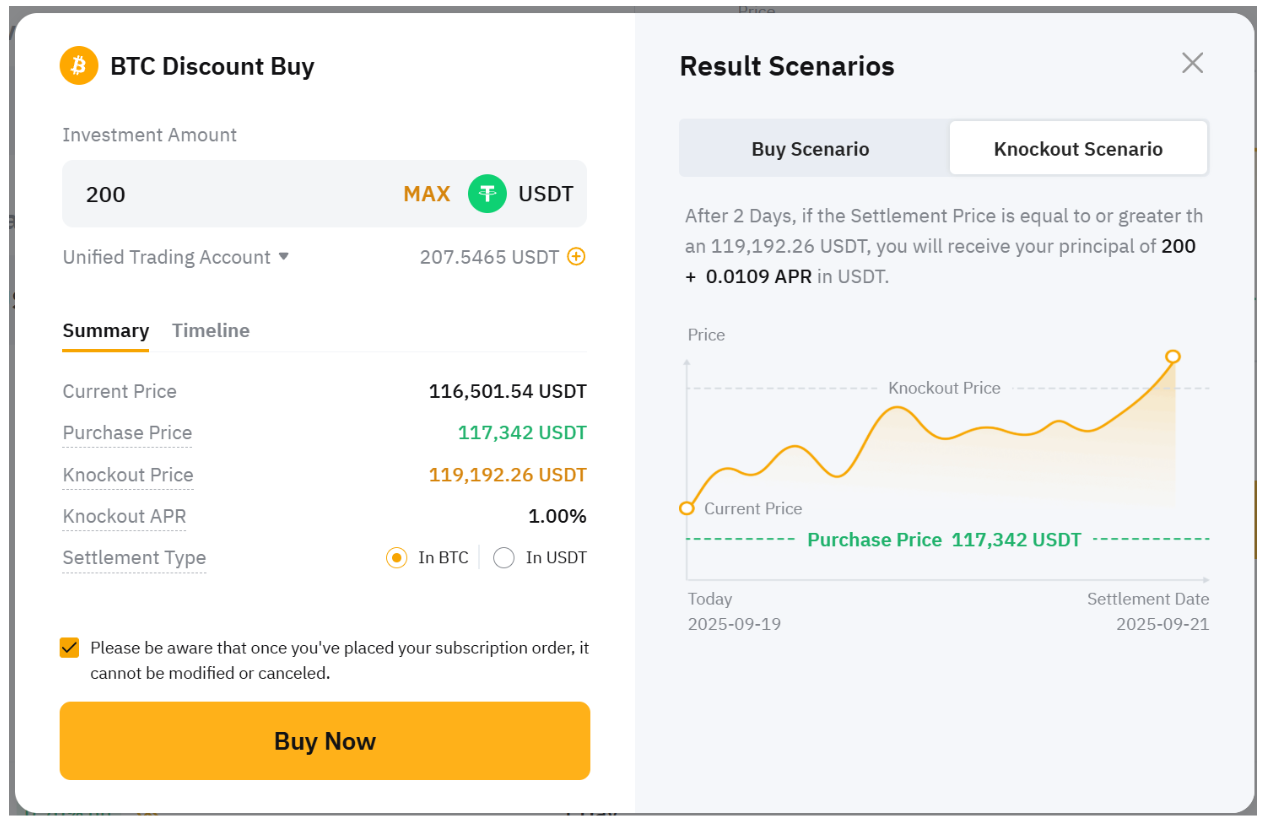 • Settle in USDT: If a crypto purchase is triggered, you will buy BTC at the Purchase Price and then sell it at the Settlement Price, with the payoff settled in USDT.