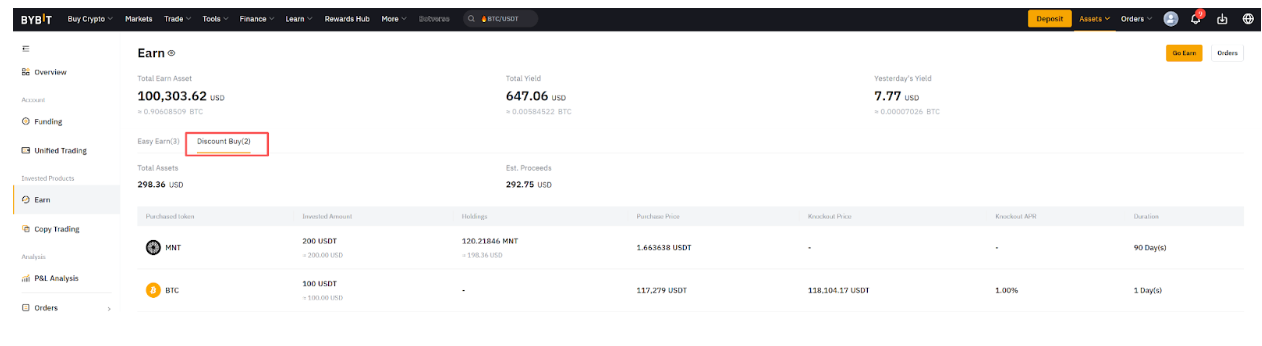 b. Go to Assets → Earn in the top-right corner of the Bybit page. Select the Discount Buy tab to see your orders.
