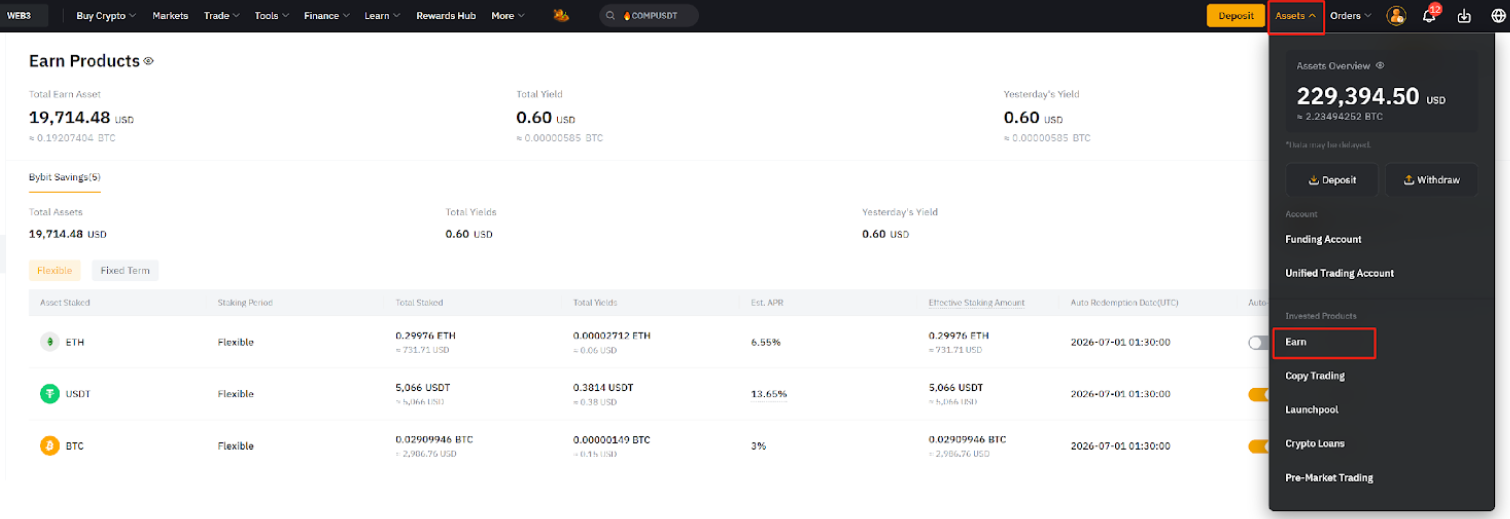 Option 1: Hover over Assets in the navigation bar and click Earn. From there, you can switch between the Flexible and Fixed Term products to view information such as your investment amount, total yield and redemption date.