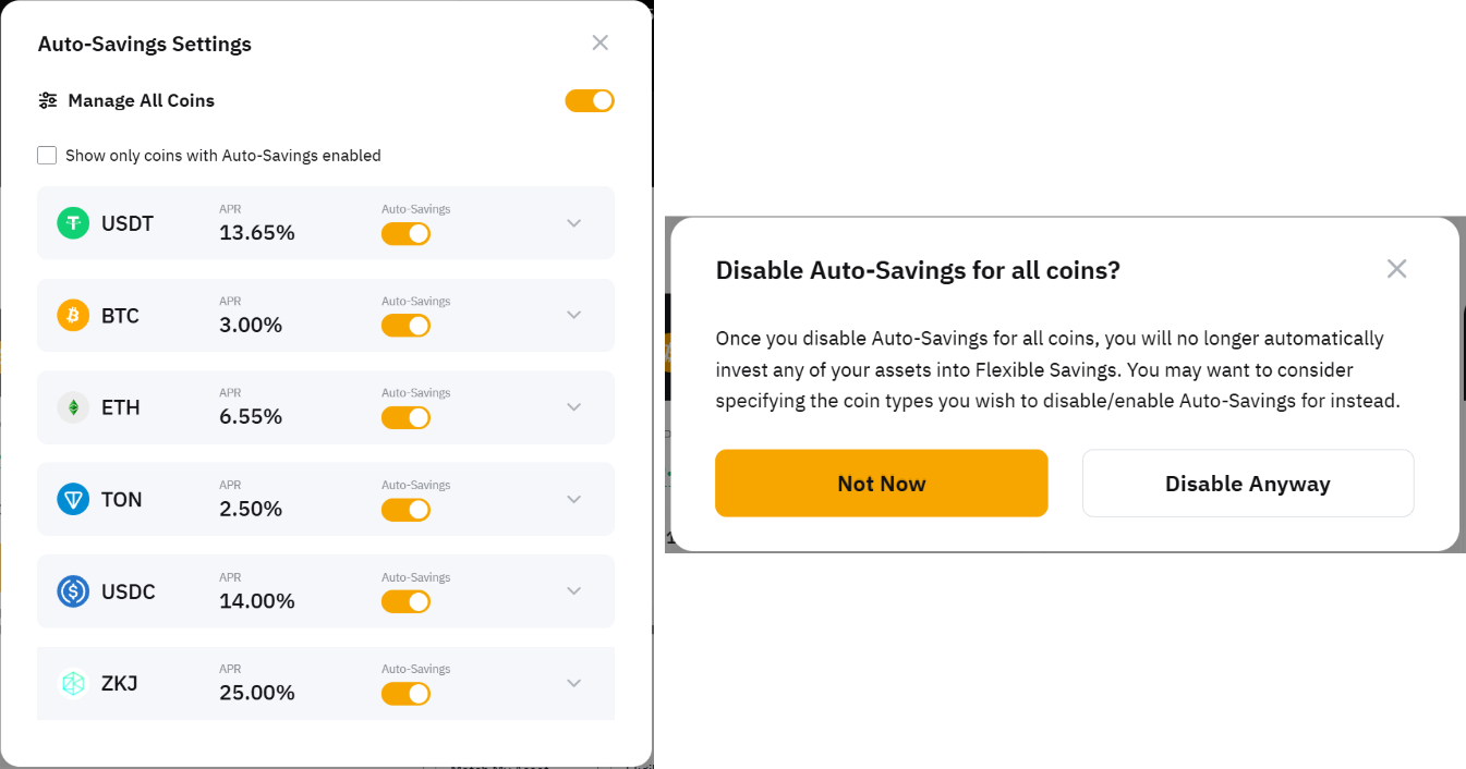 Step 3: Click Confirm. The Auto-Earn Settings page will appear. Manage All Coins is enabled by default. From here, you can toggle Auto-Earn on or off for each supported coin.