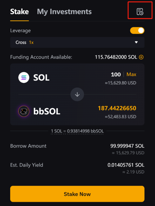 Step 1: To check your orders, click the history icon in the top-right corner of the Stake or My Investments panel on the Margin Staked SOL homepage.