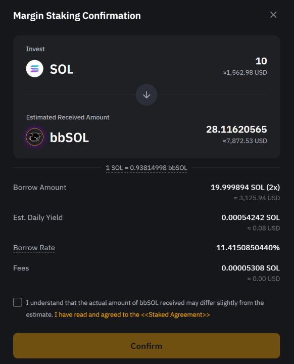 The expected amount of bbSOL you'll receive, calculated based on your leverage, staked SOL, and the real-time exchange rate between SOL and bbSOL.