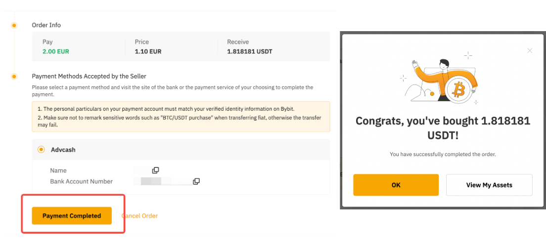 Step 4: Return to your Bybit P2P order page and click on Payment Completed once you've completed the payment. Wait patiently for the advertiser to process the coin transfer. Once the coins you've purchased have been successfully released by the seller to your Funding Account, you can click on View My Asset to verify them, along with your transaction history.