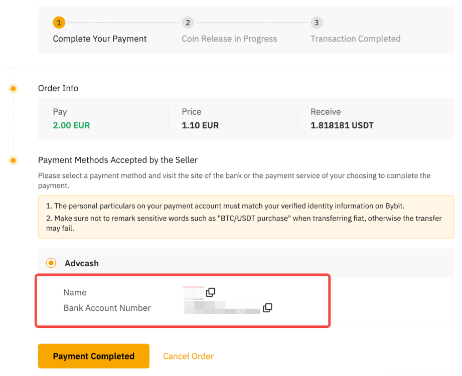 — The name on your bank account must be consistent with your registered name on Bybit. Otherwise, the advertiser may cancel the order and issue a refund.