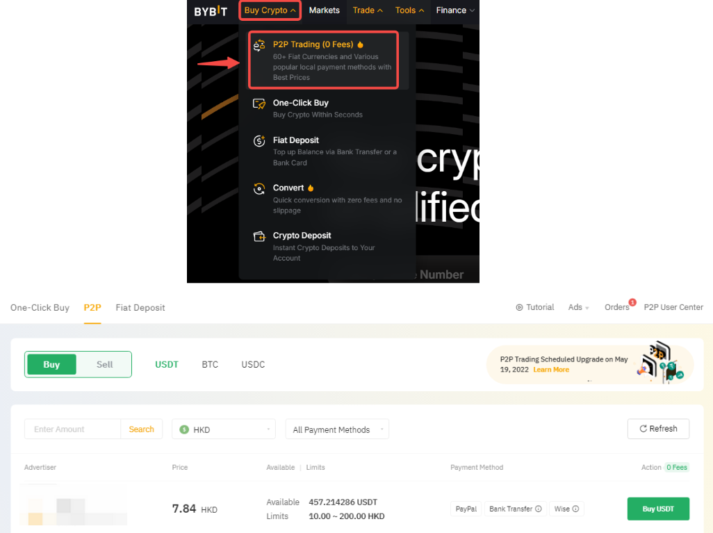 Step 1: Please click on Buy Crypto → P2P Trading on the top left corner of the navigation bar to enter the P2P trading page. If you want to buy USDT then choose your preferred advertisement, and click on Buy USDT.