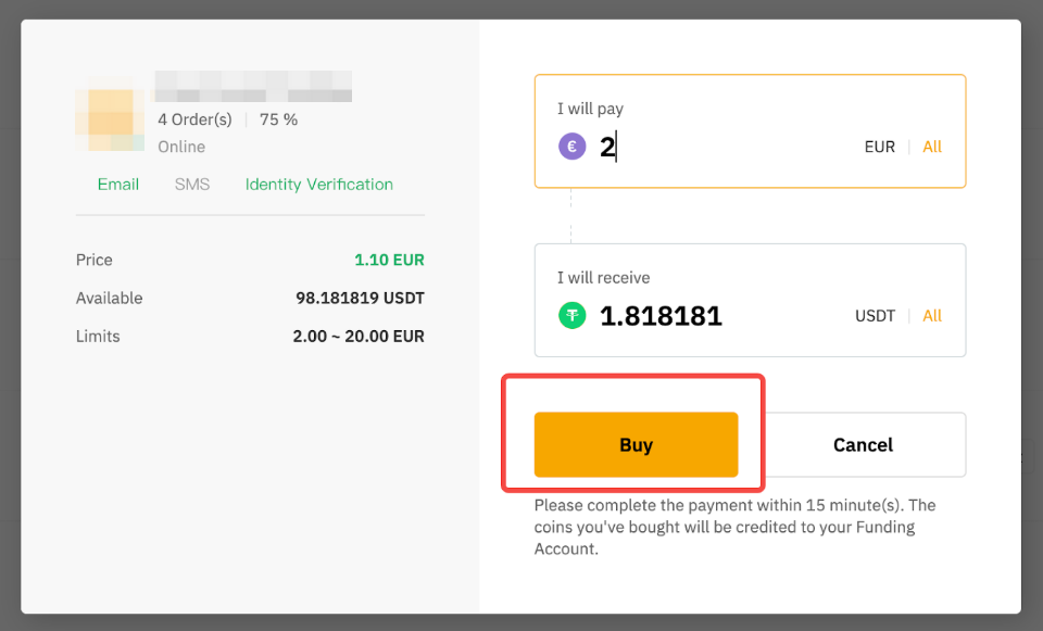 Step 2: Enter the amount of fiat you want to pay, or the number of coins you want to receive, and click on Buy to proceed.