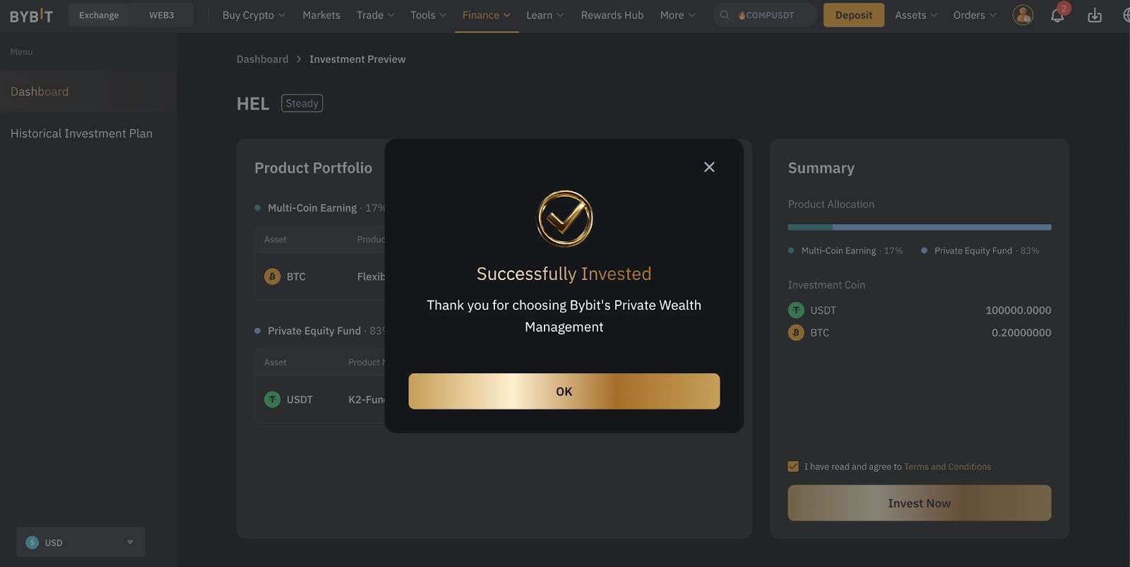 Contact a wealth consultant via the Bybit Private Wealth Management page. Your personal consultant will assess your financial goals, investment preferences, and risk tolerance to tailor a suitable investment strategy. We will review the information you submit internally and contact you if you meet the required criteria.