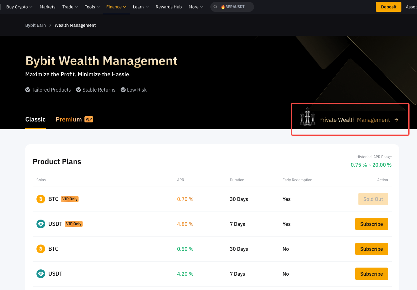 Step 1: Navigate to Finance → Earn → Wealth Management → Private Wealth Management.
