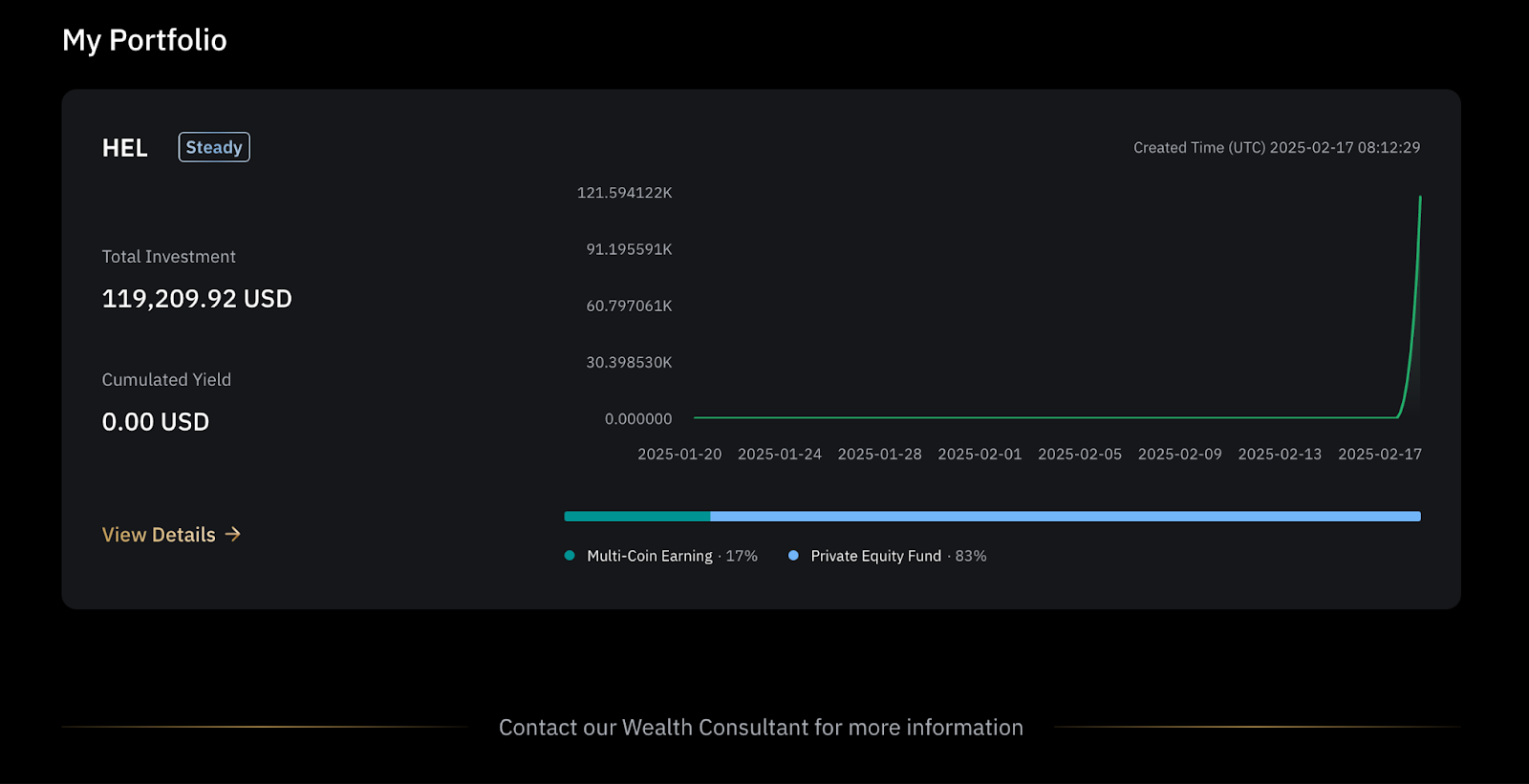 Our experts allocate premium crypto assets and investment tools tailored to your risk profile and return expectations. Once confirmed, our private wealth management team will finalize your investment plan, and the details will be accessible on your PWM dashboard.