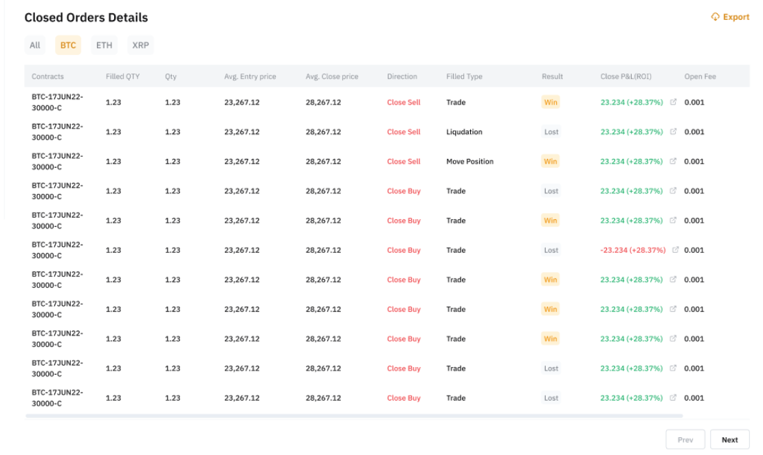 In the Details of Closed Orders tab, you can select All to view all closed orders. Alternatively, you can access comprehensive order information for specific contracts, including contract name, filled quantity, average entry price, average close price, filled type, and more.