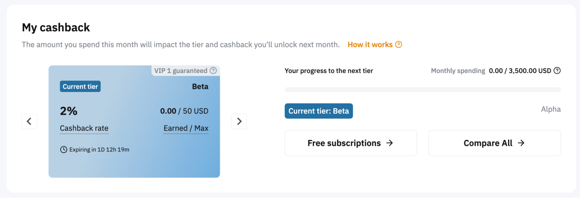 Seu gasto mensal total no Cartão Bybit e no Pagamento é agregado para determinar seu nível e cashback.
