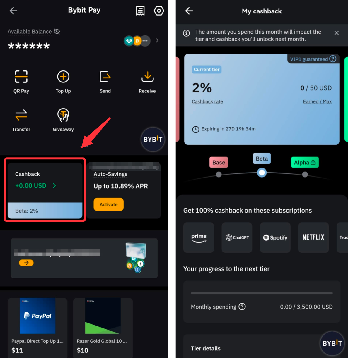 Você pode ir para a Página do Bybit Pay e tocar na seção Cashback para visualizar o progresso. Observe que o cálculo e o progresso dos gastos serão redefinidos no 1o dia de cada mês.