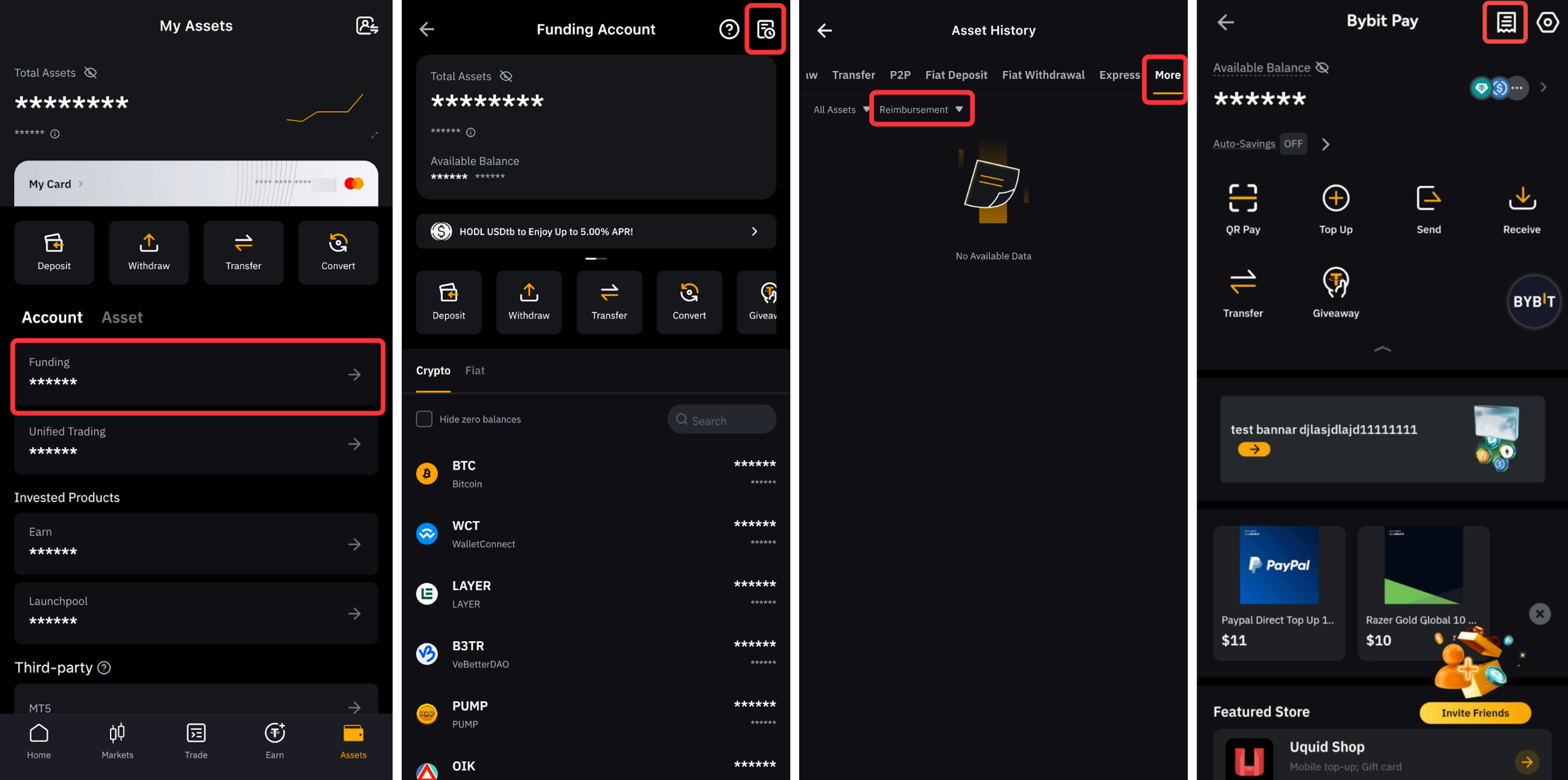 No aplicativo, vá para Ativos → Conta de fundos → Mais e, em seguida, filtre o tipo para Bybit Pay. Como alternativa, você pode acessar a página Bybit Pay e tocar no ícone de papel no canto superior direito.