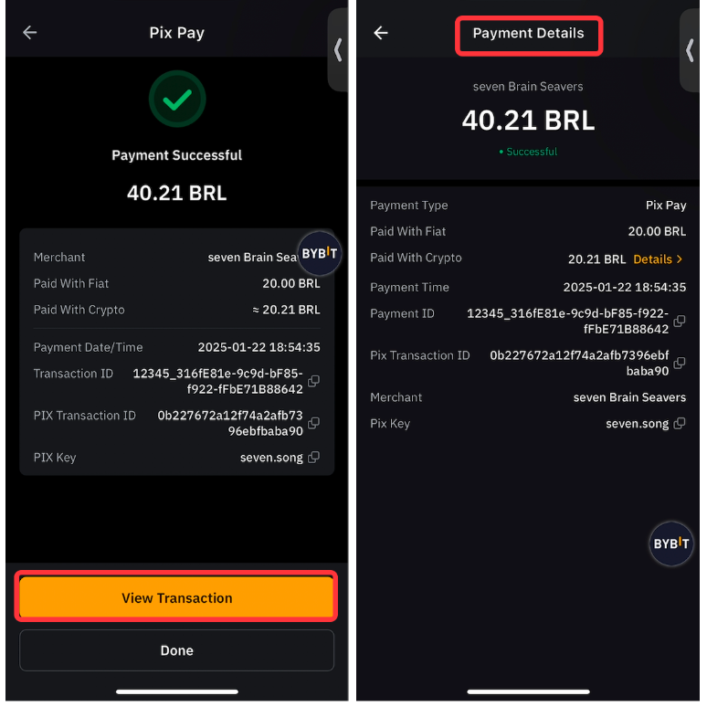 Todo o histórico de transações, incluindo o PIX Pay com um cartão Bybit e o Bybit Pay, será registrado no histórico de transações do Bybit Pay.