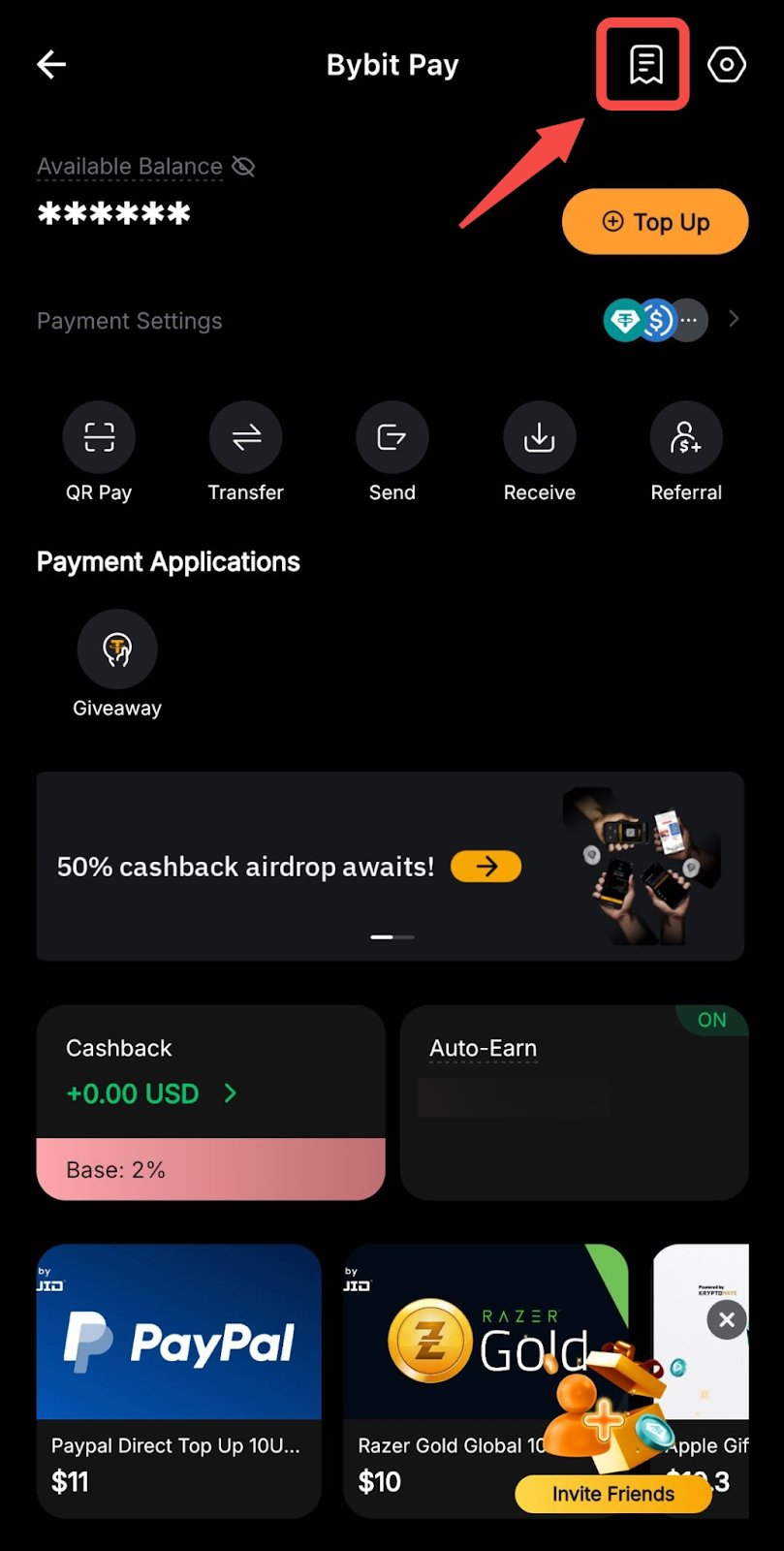Para visualizar seu histórico de pagamentos, você pode acessar a página Bybit Pay e clicar no ícone Papel no canto superior direito.