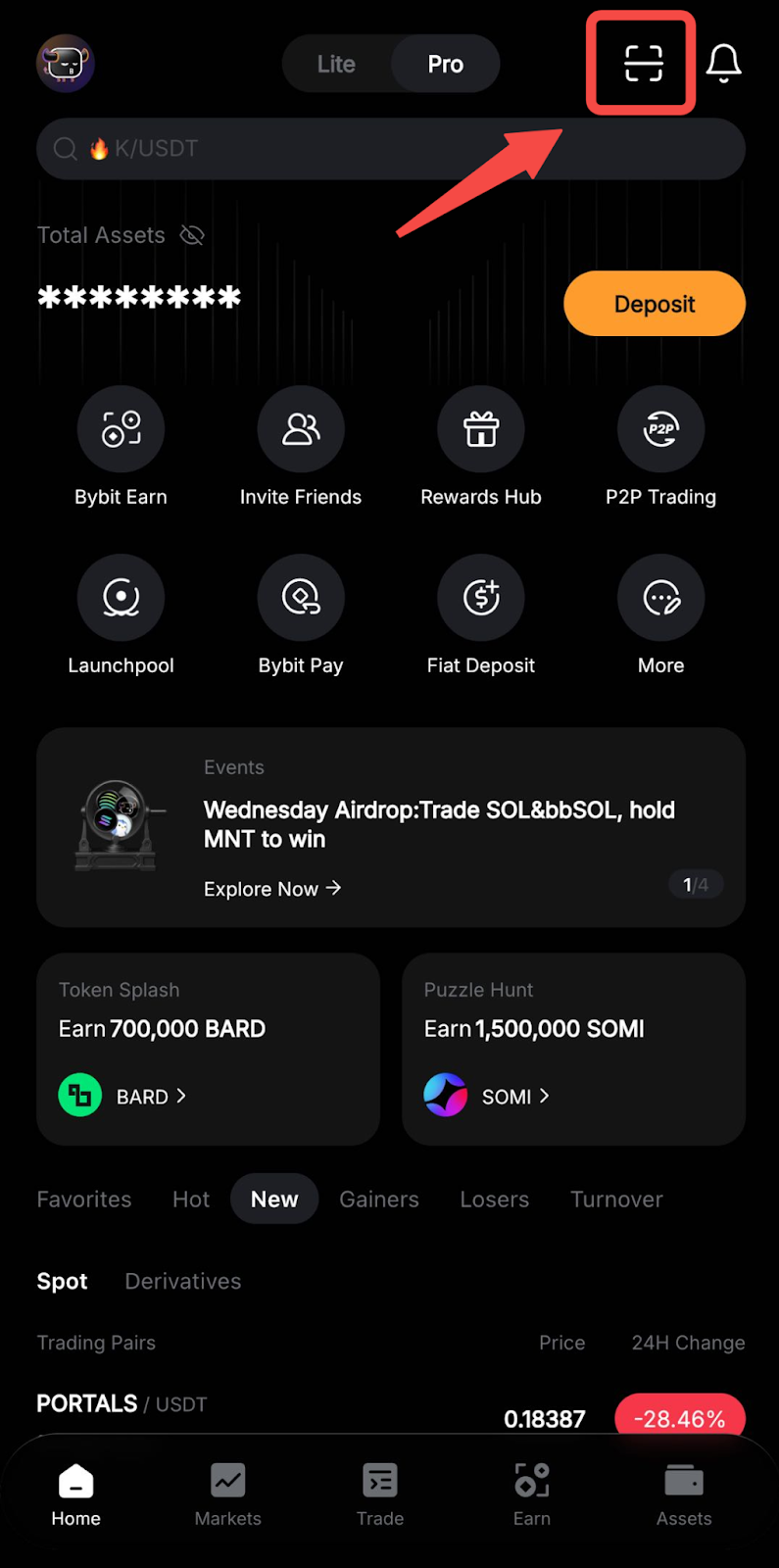 Etapa 1: Na página inicial do Bybit, toque no ícone Scanner para abrir o scanner QR.